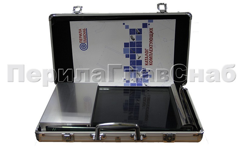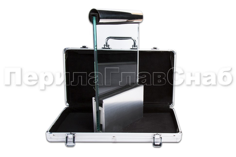 Металлический кейс обитый изнутри черным бархатом. Внутри находится зажимной профиль k601со стеклом 12 мм и поручнем 60х40, ф48 или ф42 (на ваш выбор).