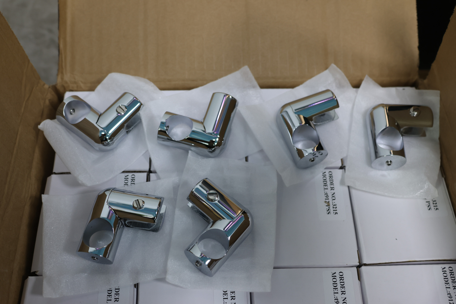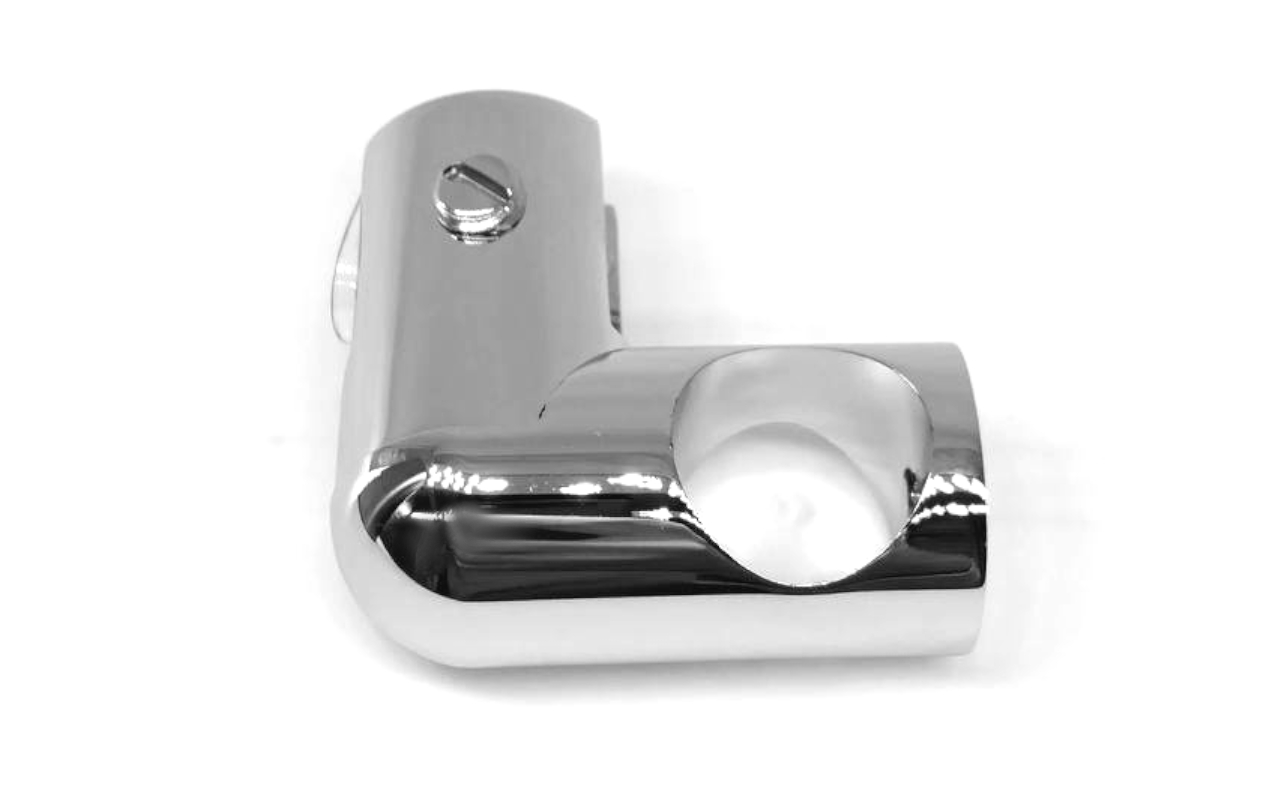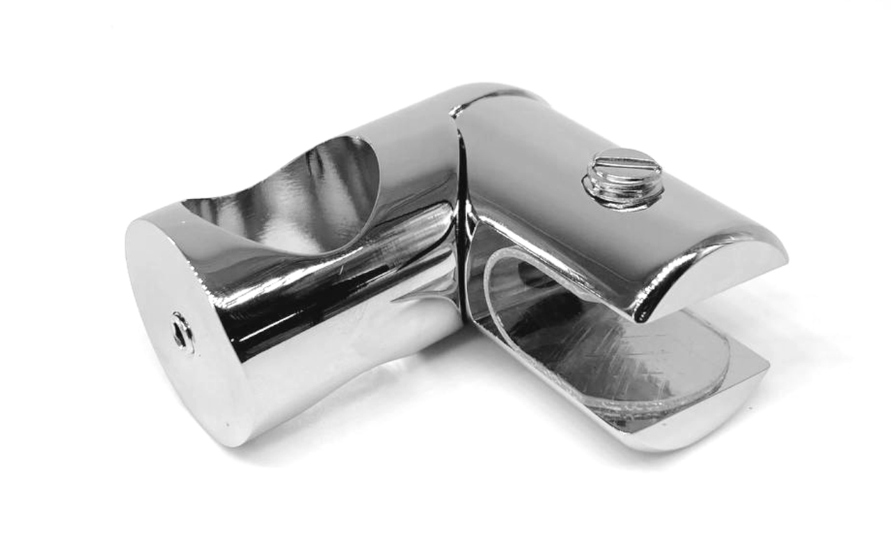 Коннектор предназначен для крепления круглой трубы 19 мм к стеклу в горизонтальной ориентации параллельно стеклу, при монтаже штанг верхней обвязки душевых кабин.