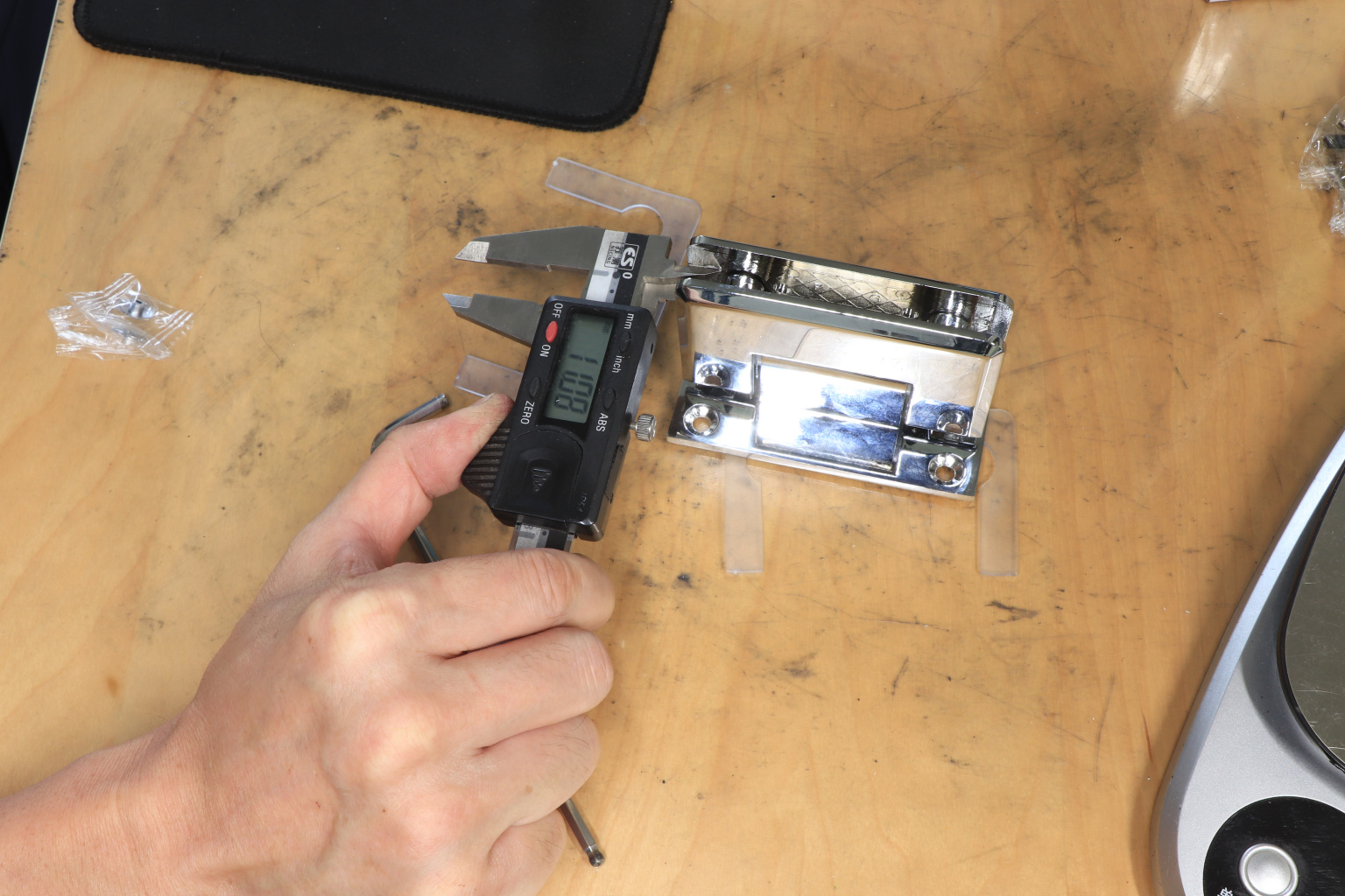 Петля из нержавеющей стали с полированной поверхностью из нержавеющей стали предназначена для стыковки между собой конструкционных элементов из стекла, толщина которых находится в диапазоне от 8 до 10 мм. Максимальный вес двери на 2 петли составляет 45 кг. В конструкции заложена система скрытого крепежа. Имеет функцию доводчика до закрытия от 25°. Максимальный угол разведения стыковочных элементов в плане составляет 90°. Крепление предусмотрено с двух сторон на 4 винта со шляпками заподлицо (по 2 винта на каждую сторону). Размер одной стороны петли составляет 90х55 мм.