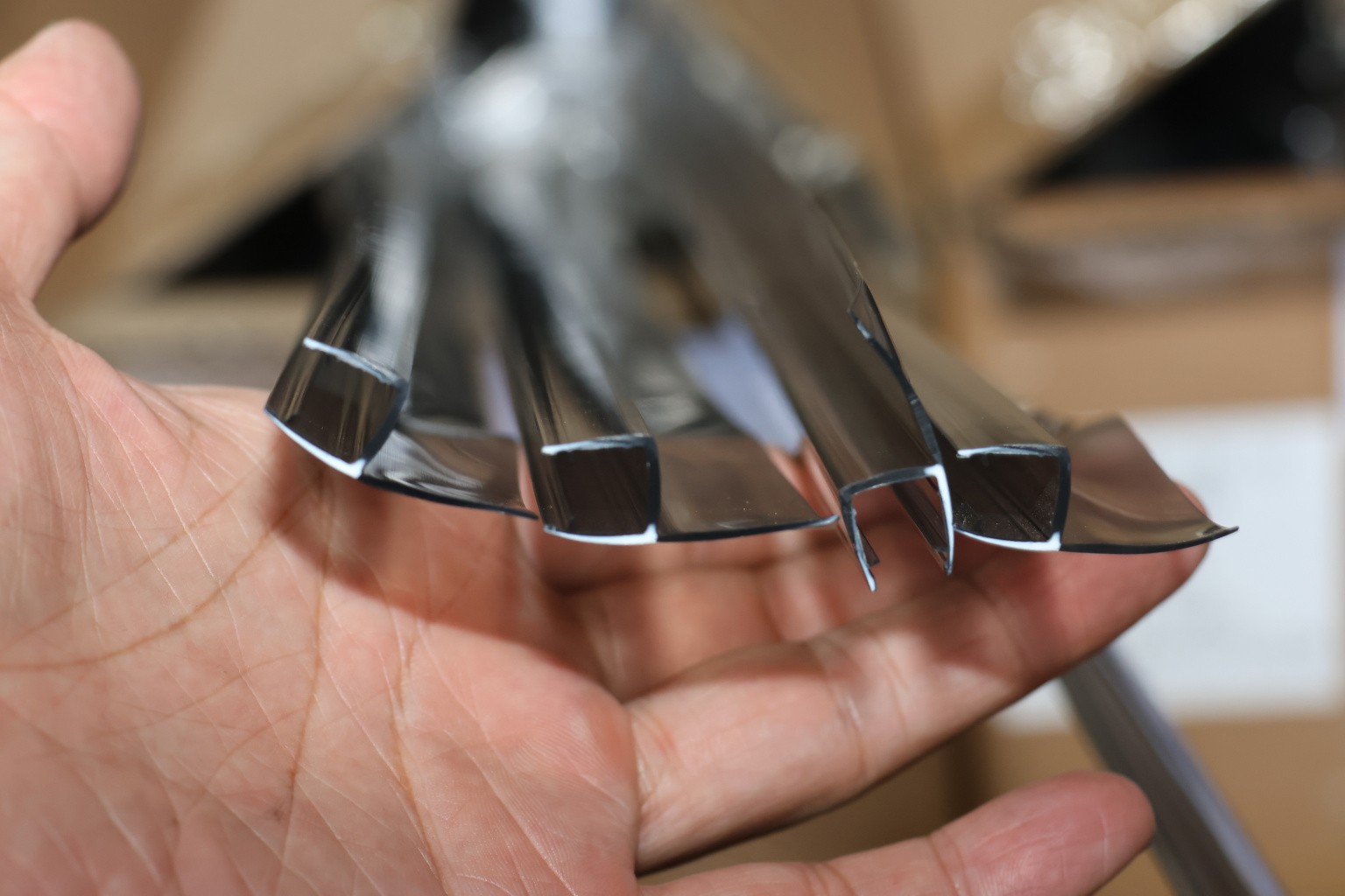 Уплотнитель имеет исполнение черной полупрозрачной поверхности, выполнен из материала ПВХ. Имеет Ч-образный профиль. За счет своих свойств (стойкость к щелочам, минеральным маслам и многим кислотам) прекрасно подходит для крепления стеклянного листа по всему периметру. Позволяет соединять стеклянные панели между собой.