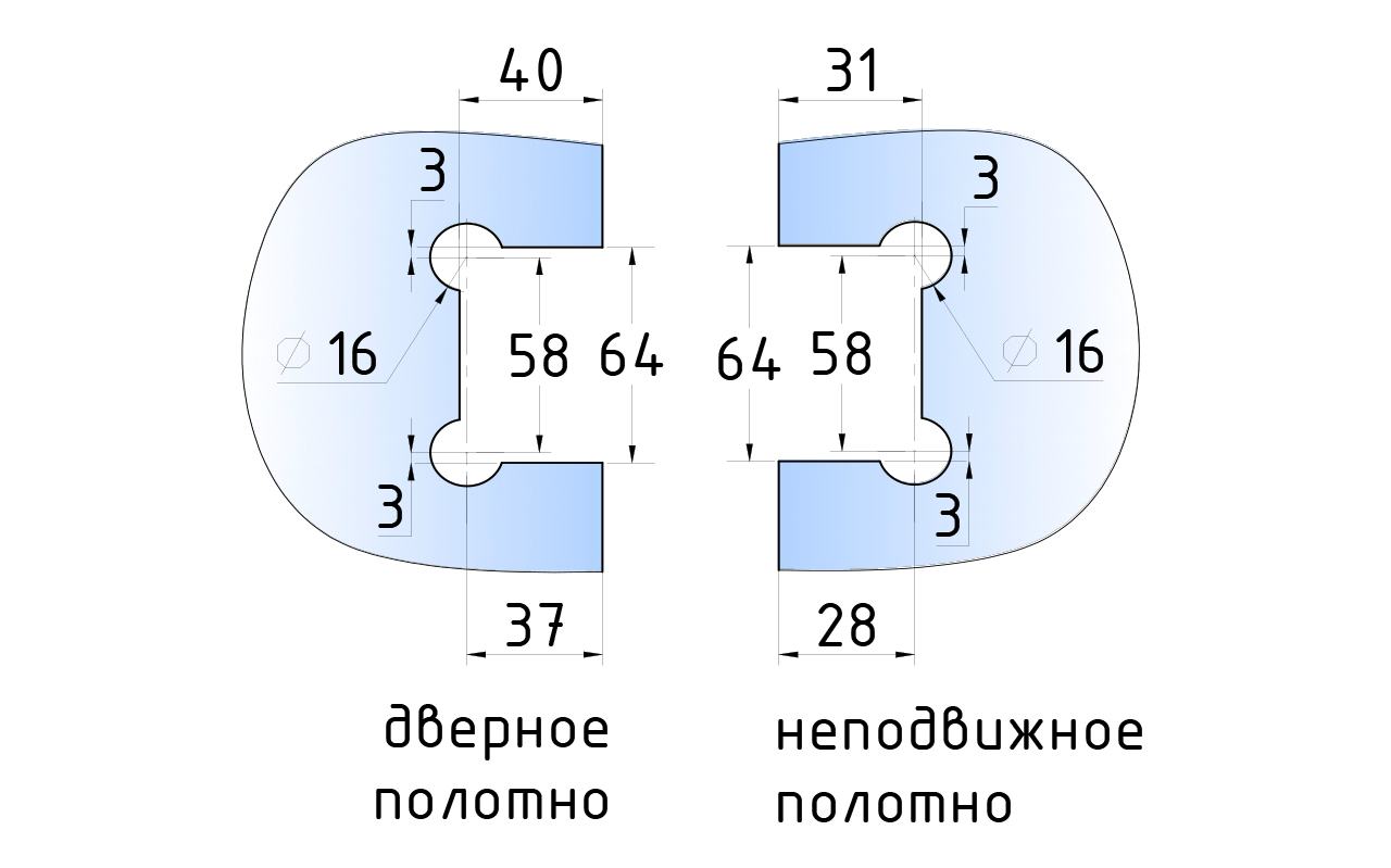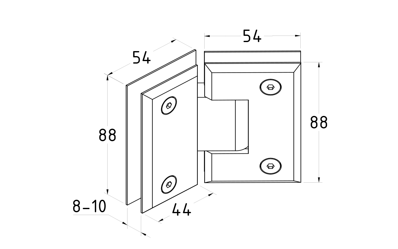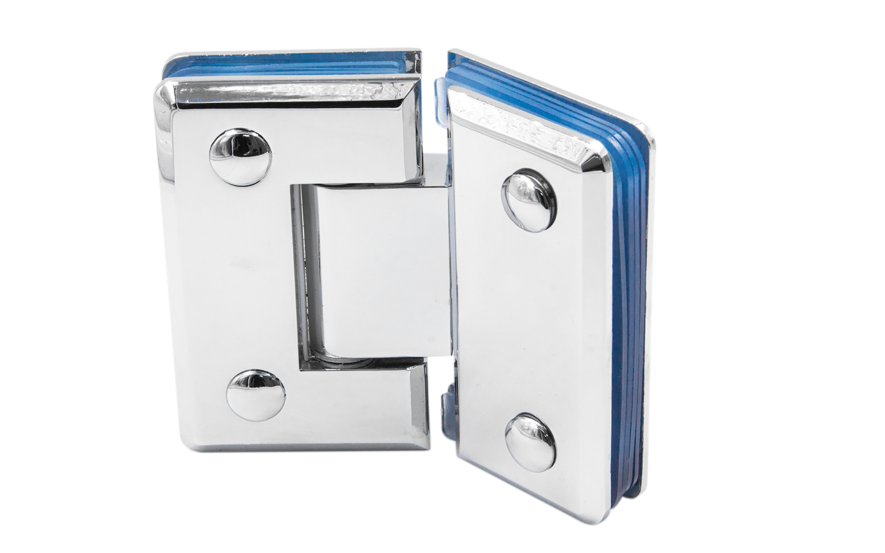 для стыковки между собой конструкционных элементов из стекла, толщина которых находится в диапазоне от 8 до 10 мм. В ней реализована функция самозакрытия и поворота в обе стороны. Петля стекло-стекло крепится с обеих сторон на стеклянные поверхности, плотно прижимаясь к ним своими металлическими зажимами.