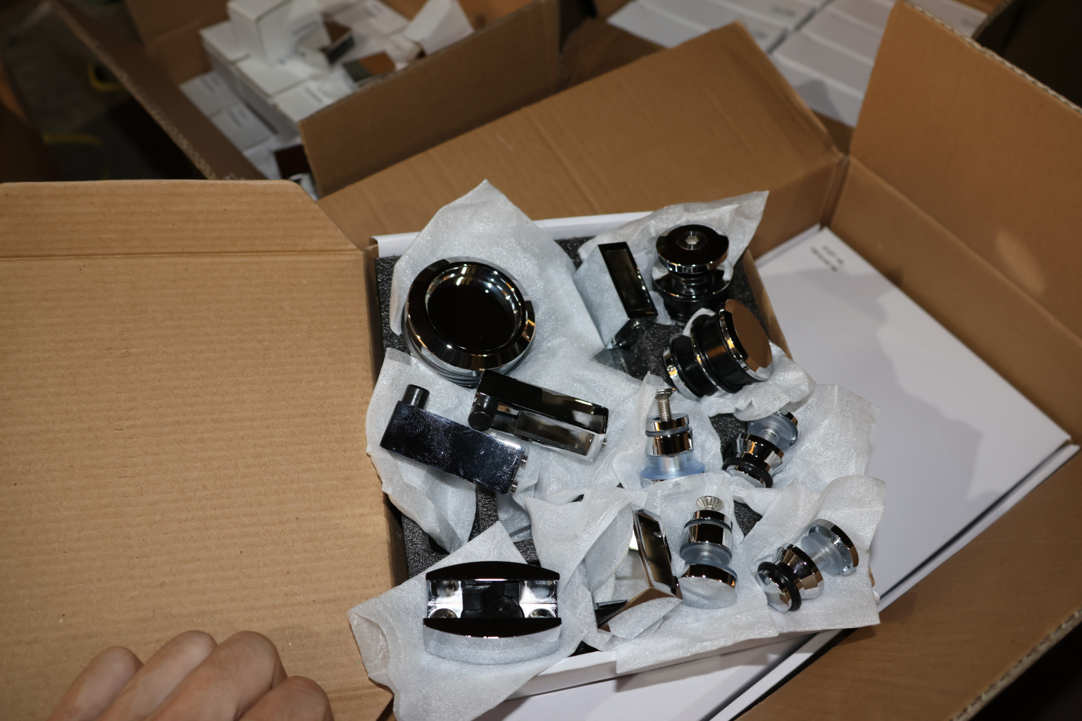 ролик (2 шт.), крепеж стекла к трубе (2 шт.), крепеж направляющая (2 шт.), напольная направляющая (1 шт.), торцевое крепление трубы к стене (2 шт.), стопор (2 шт.)