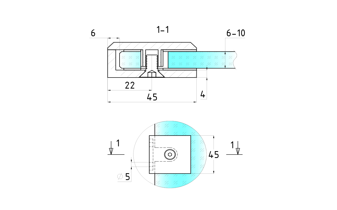 Коннектор разбирается на две половинки, Г-образной стороной крепится к стене на саморезы. Затем к нему прикладывается стекло с заранее заготовленным вырезом согласно чертежу, а далее второй половинкой стекло зажимается.