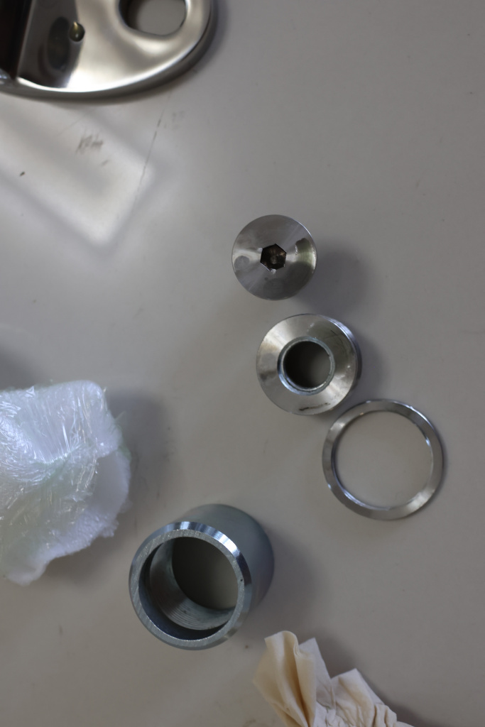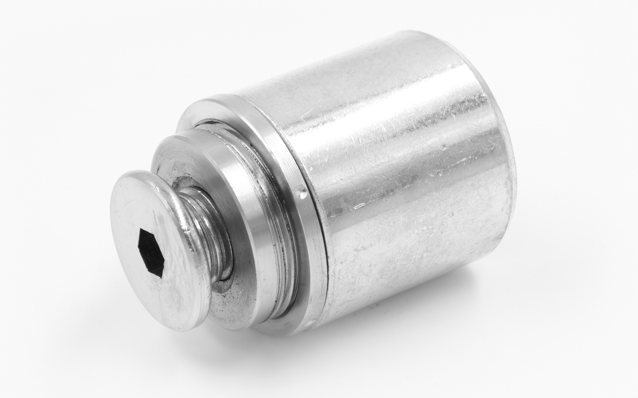 О-болт. Деталь состоит из трёх основных элементов: основания, регулировочной шайбы и винта. Основание выполнено из чёрного металла, а шайба и винт из стали AISI 304. Основание имеет диаметр 44 мм. Винт с прослабленной резьбой М16. Регулировочная шайба позволяет устанавливать расстояние крепящегося элемента в диапазоне одного сантиметра. Выдерживает нагрузку более 300 кг.