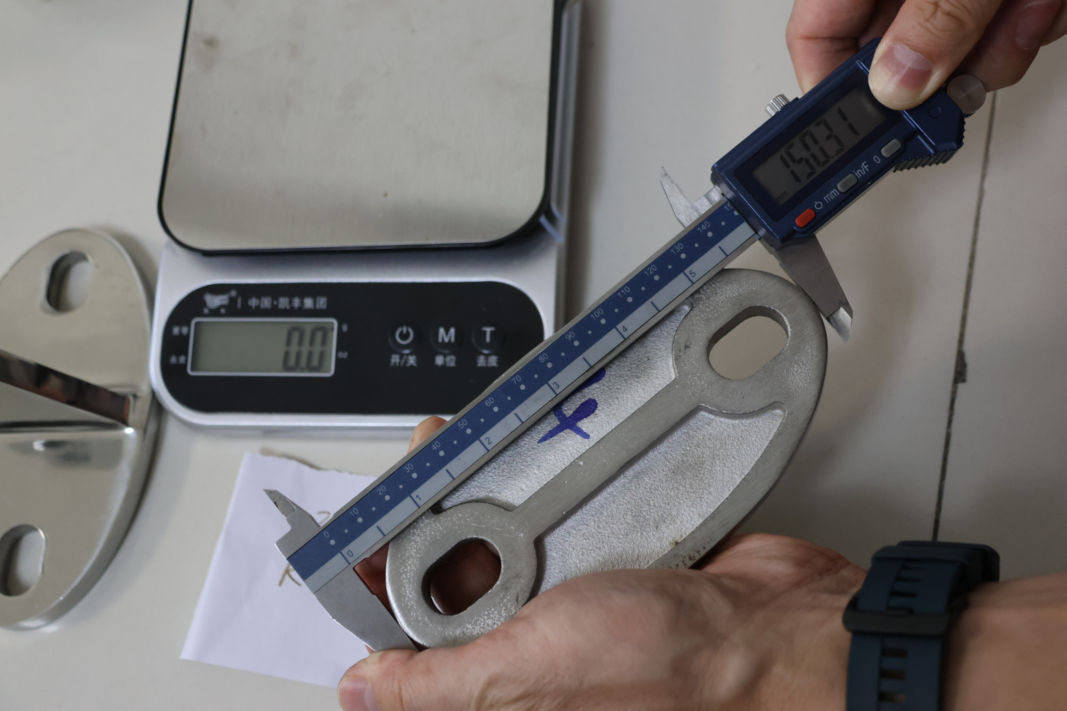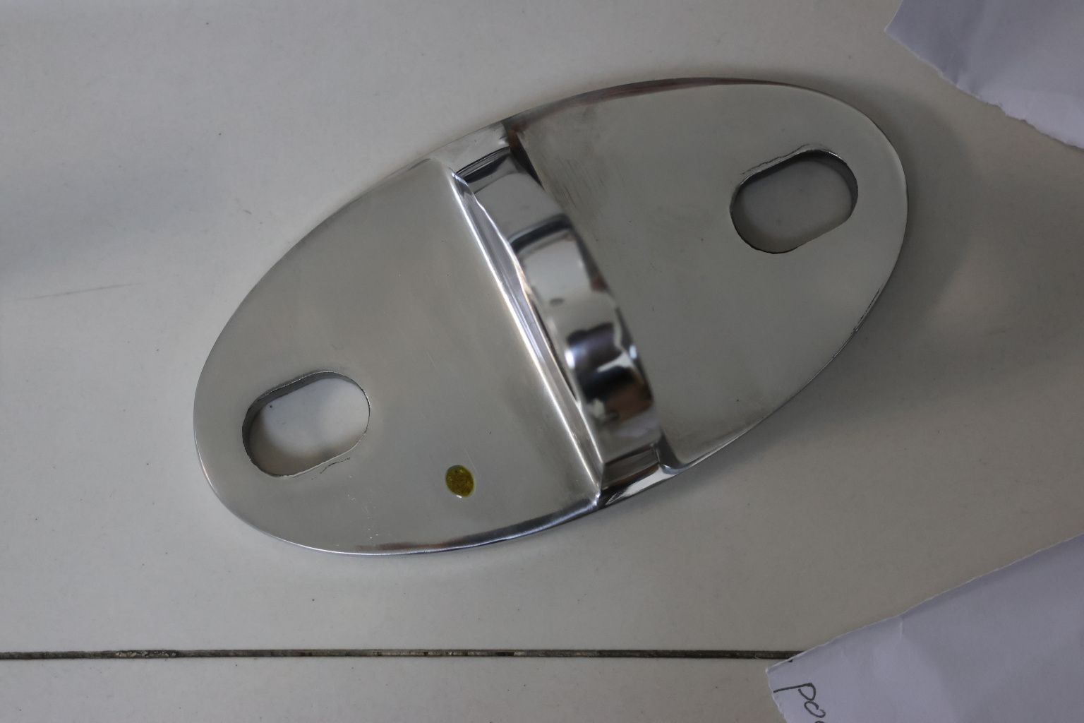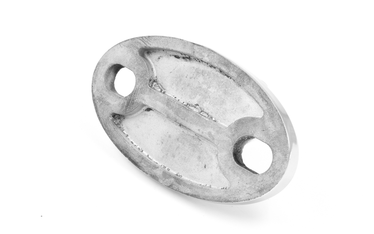 Крепление тяги к стене. Литая, полированная деталь. Состоит из крепёжного элемента с двумя овальными технологическими отверстиями 16,3 на 25 мм для крепления к стене и выносной части с отверстием диаметром 20 мм для крепежа наконечника тяги. Выполнена из стали AISI 316. Ширина детали – 150 мм, расстояние между центрами крепёжных отверстий – 105 мм. Выносная часть выступает на 48 мм от стены.