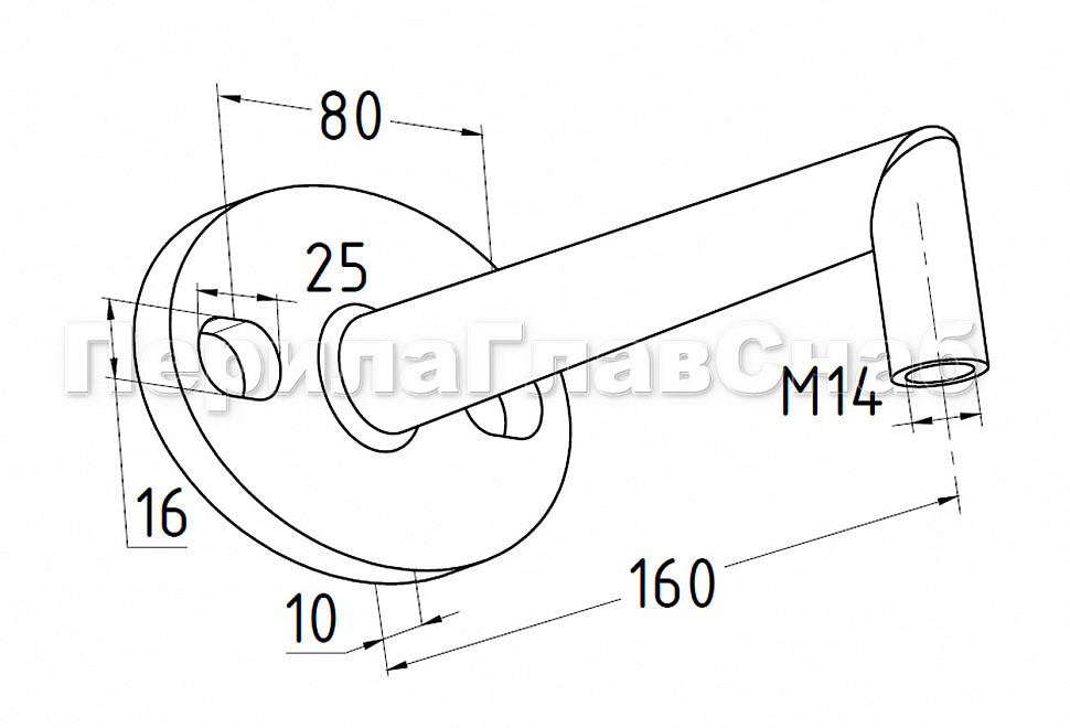 Держатель для подвеса стеклянного козырька (Соединение стена- рутель). Литая, полированная деталь, выполненная из стали AISI 304. Состоит из фланца толщиной 10 мм и шириной 80 мм и дистансера с резьбой М14. Размер дистансера 160 мм от стены до центра отверстия. На основании имеется два овальных крепёжных отверстия размером 16,5 на 25 мм.