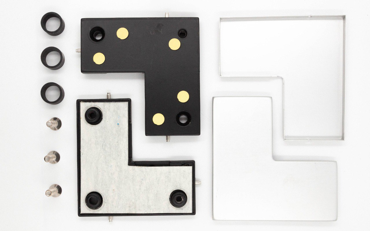сбоку нажимаем на крепления крышек и снимаем. Отвинчиваем винты, и фиксируем фитинг в подготовленный вырез в стекле. Далее закручиваем и фиксируем обратно крышки.