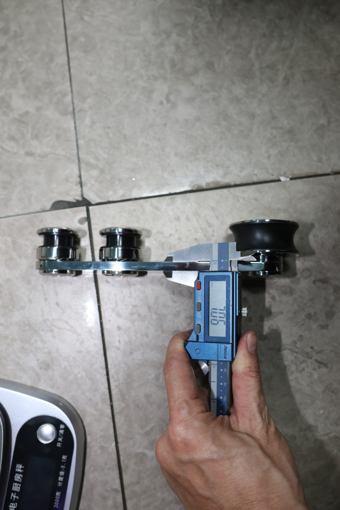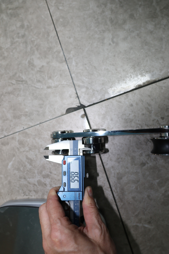 Толщина стекла лежит в диапазоне 10 -12 мм. В один комплект входит: каретка (2 шт.), крепление трека к стеклу (4 шт.), напольная направляющая двери (1 шт.), стопор для каретки (2 шт.), заглушка трека (2 шт.). На расчет расстояния между креплениями трека оказывают влияние: вес двери, ширина прохода, ширина стенового портала, высота неподвижного стекла, а также высота общая (от нижнего края фрамуги до пола).