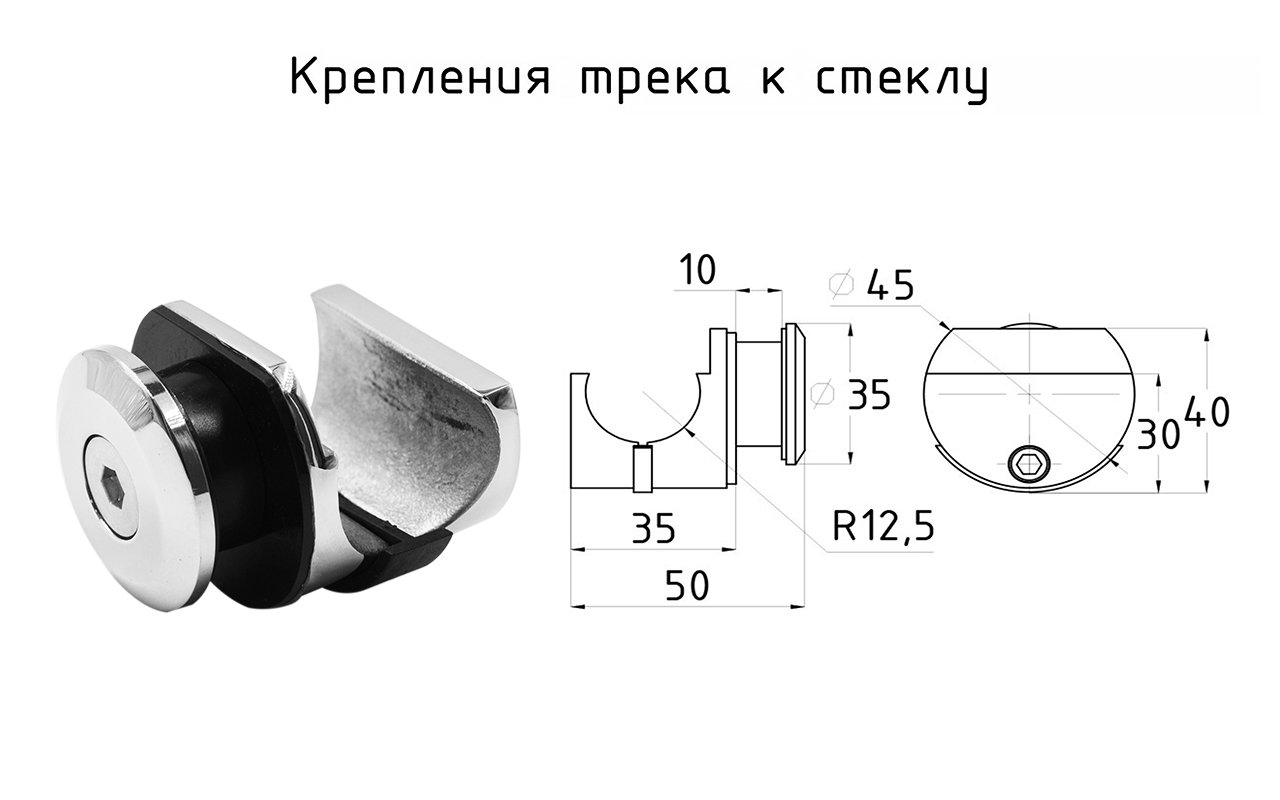 1. устанавливается на стеклянную фрамугу при помощи отверстия в стекле, рассверлить под размеры втулки коннектора, и зажимается с другой стороны стекла. Вторая часть коннектора крепится к треку. Она имеет круглый профиль, состоит из двух элементов - фиксируют трек в коннекторе.