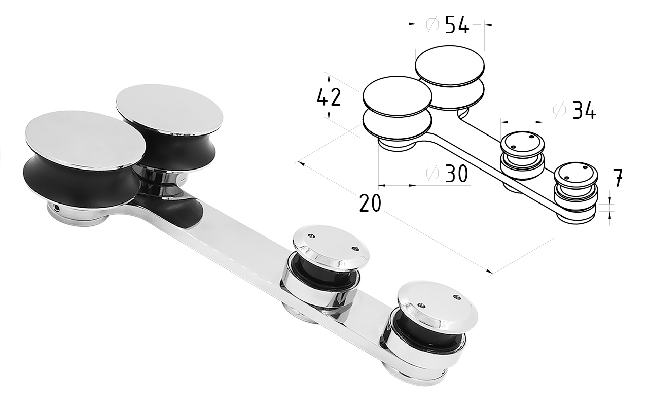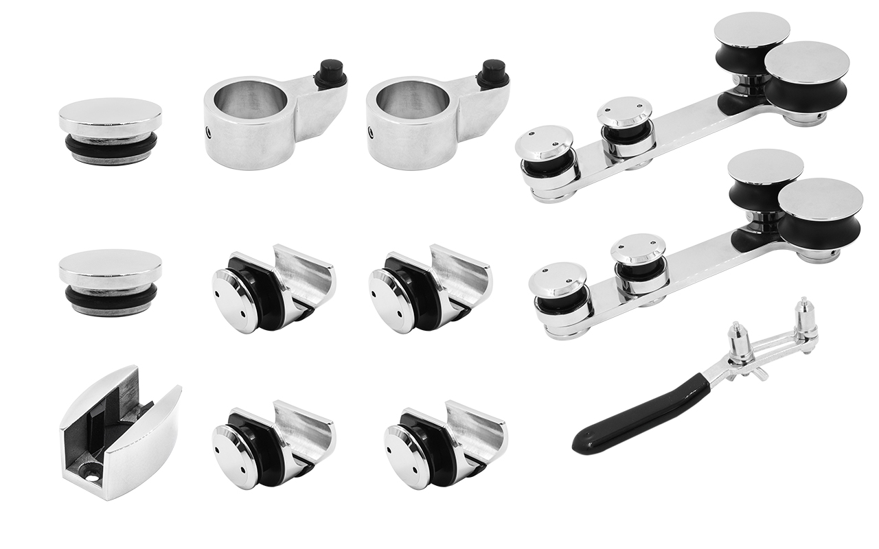 Комплект раздвижной системы для стеклянных дверей, марка стали- AISI 304, полированный. Максимальный вес двери на две каретки 120 кг.