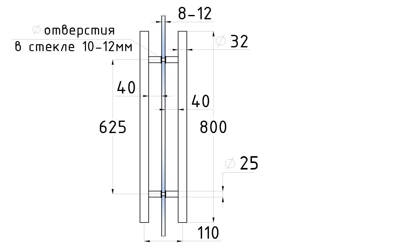 Ручка для стеклянной двери рейлинг двухсторонняя для стекла 8-12 мм, 32х625х800 мм, шлифованная, марка стали- AISI 304