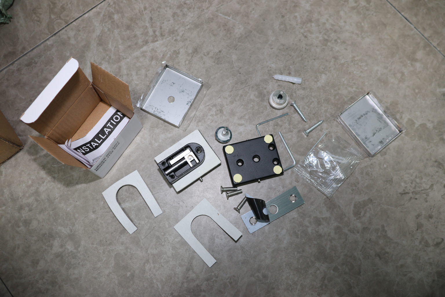 Сбоку нажимаем на крепления крышек и снимаем. Отвинчиваем винты, и фиксируем защелку замка в подготовленный вырез в стекле. Далее закручиваем и фиксируем обратно крышки.