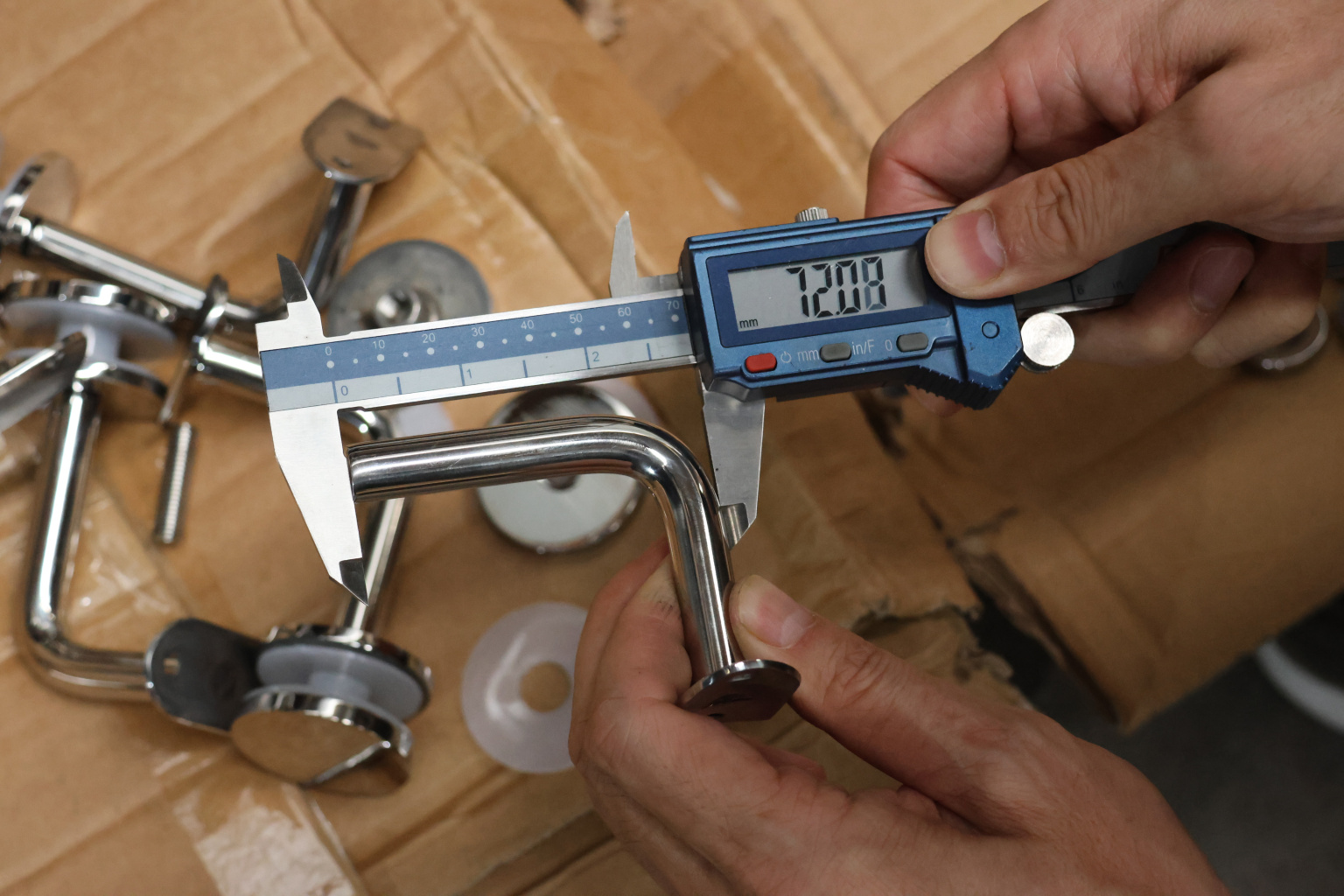 Для установки бокового держателя в стекле сверлится отверстие диаметром 17 мм, затем пристенок фиксируется затяжной гайкой в торце фланца. А сам поручень приваривается к загнутому наконечнику фитинга.