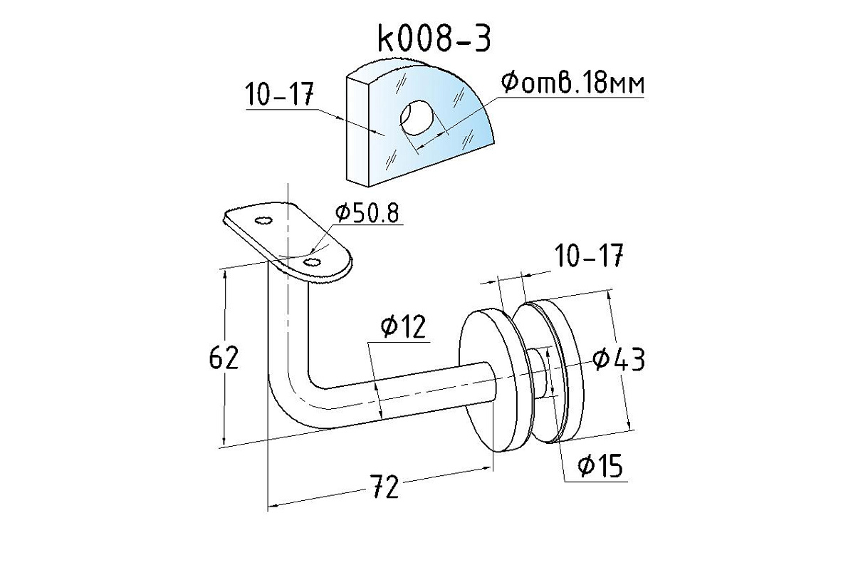 Применяется для бокового крепления нержавеющего поручня на стекло.