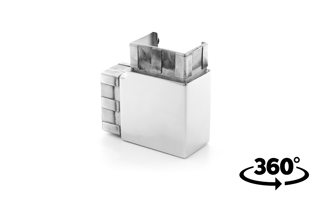 Фитинг предназначен для поворота поручня самосборных ограждений с несущим стеклом или с подсветкой под углом 90 градусов в горизонтальной плоскости.