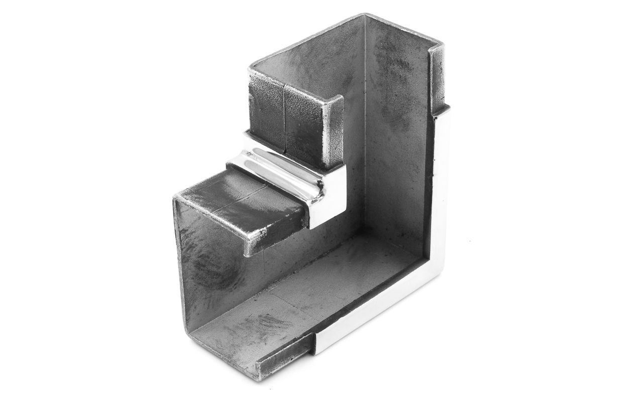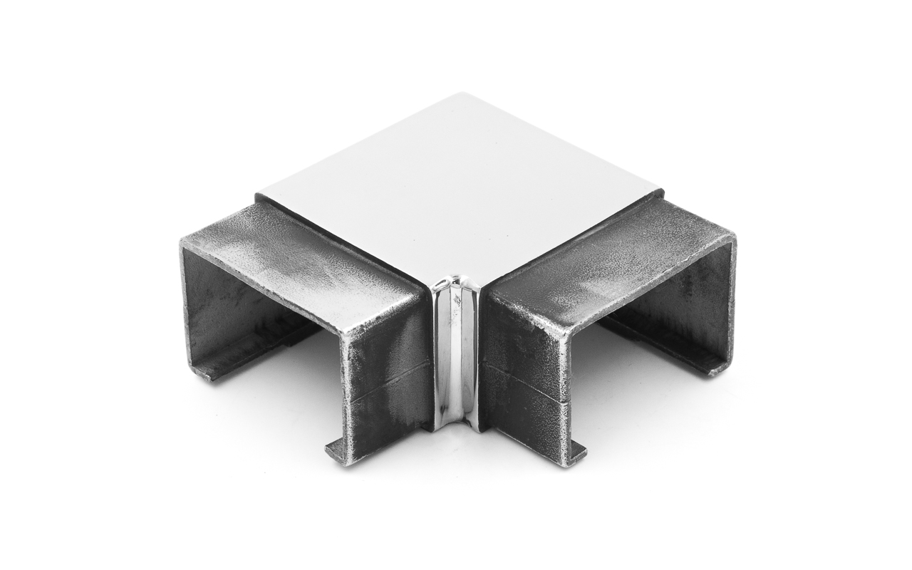 Фитинг предназначен для поворота поручня самосборных ограждений с несущим стеклом или с подсветкой под углом 90 градусов в горизонтальной плоскости.