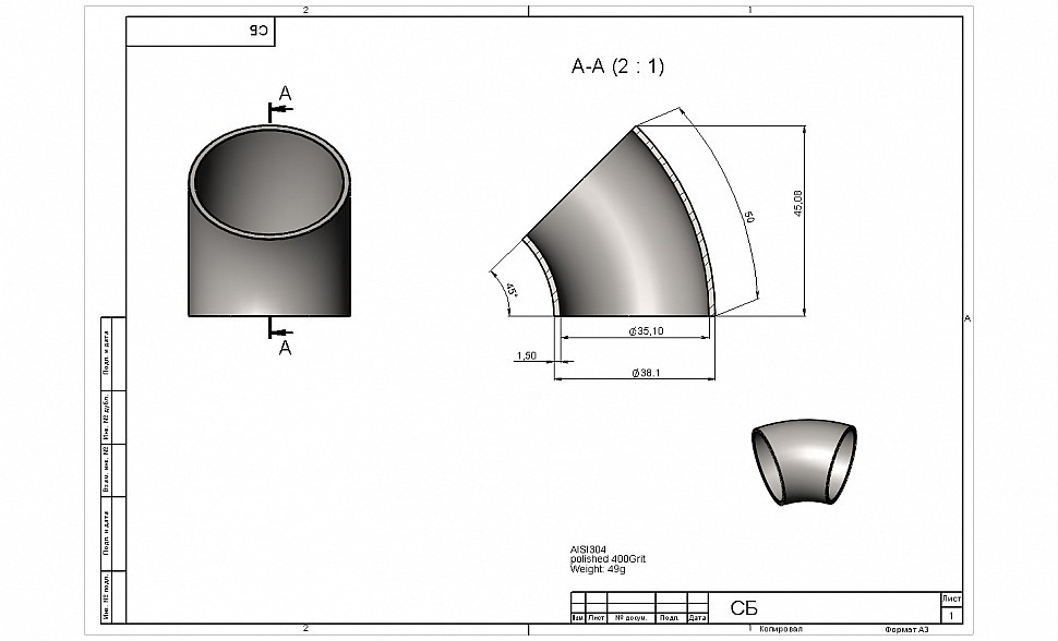 Отвод поручня под сварку Ø38.1х100/2х1.35 мм, 45°, полированный 400 Grit, (AISI 304) k095-45