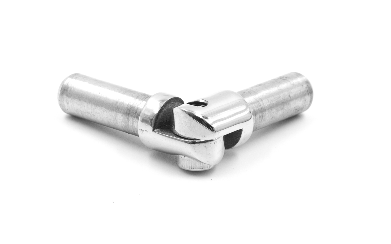 Деталь используется монтажниками для завязки нержавеющих ригелей на поворотах ограждения. Технология применения следующая: деталь разбирается на две части, каждая из которых забивается внутрь трубки ригеля. Затем обе ригельных струны привариваются или монтируются на бочатах ригеледержателей к стойкам ограждения. Концы трубок с забитыми внутрь половинками фитинга сводятся вместе и стопорятся центральным штатным винтом.