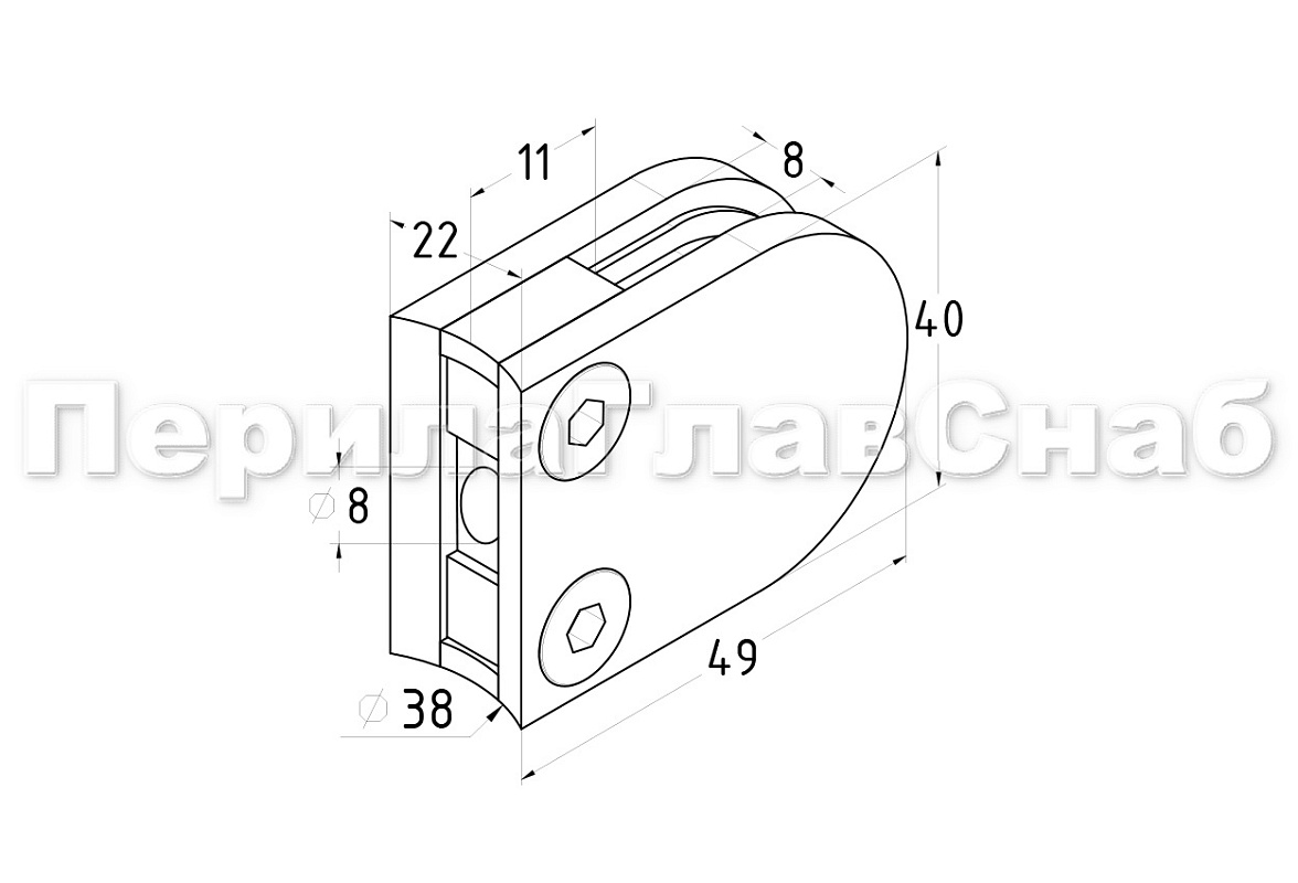 Стеклодержатель литой под стекло 8 мм (4+4 мм), под стойку Ø38.1 мм, (40х22х49), полированный. Марка стали - AISI 316