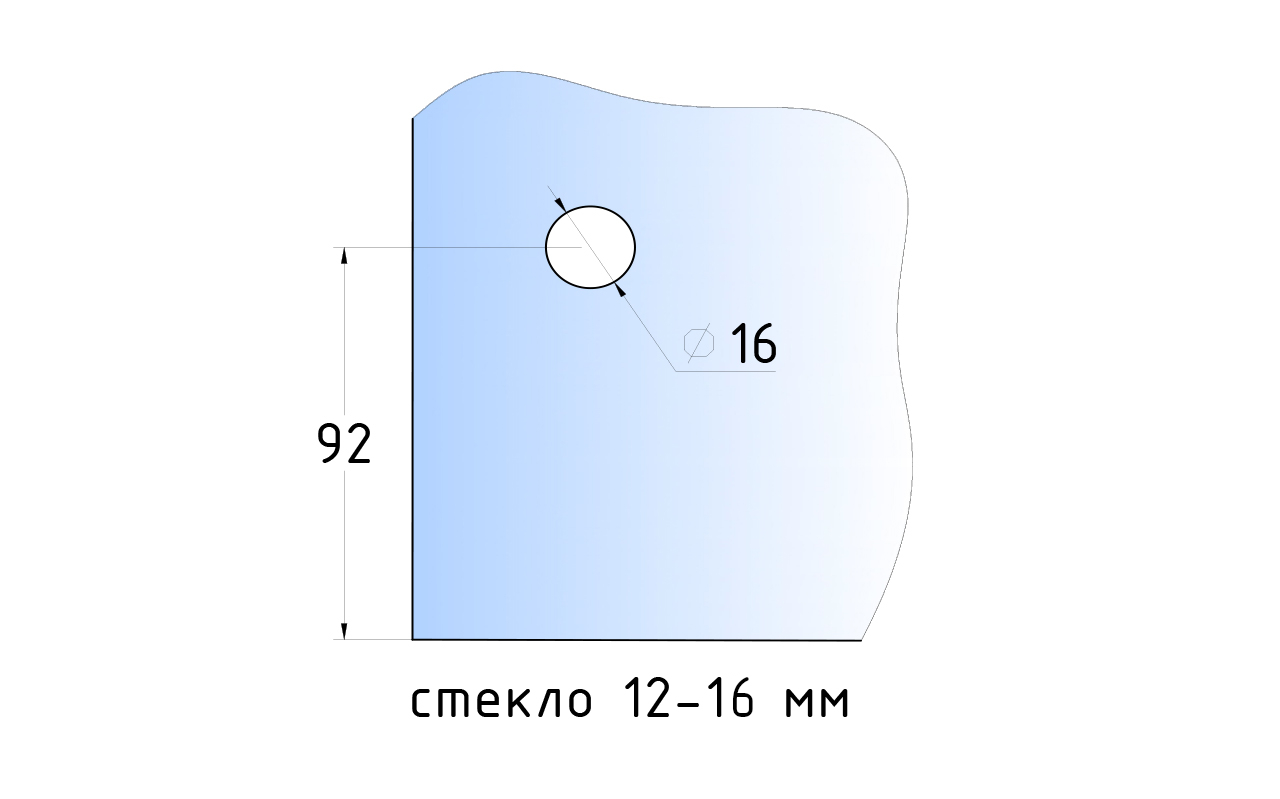 Для крепления требуется отверстие в стекле. Стойка идеально подходит для стекла 12 мм (6+6) с 2 уплотнителями. В зависимости от того, какое стекло нужно зажать, варьируется количество уплотнителей, каждый из которых имеет толщину 0.4 мм. Для стекла 10 мм (5+5) рекомендуется использовать дополнительные уплотнители из комплекта. Для закрепления стекла в стойке винт необходимо укоротить и установить вместо стандартного нижнего винта. При таких манипуляциях возможно появление щели в нижней части стеклодержателя, но на его несущую функцию это никак не повлияет.