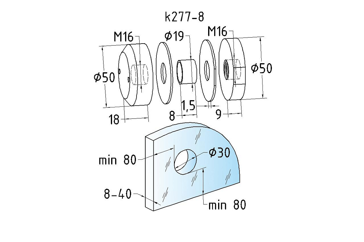 Комплект торцевого крепления несущего стекла, гайка-шайба Ø50х10х18 мм с внутренней резьбой М16, шлифованный AISI 304 k277-8