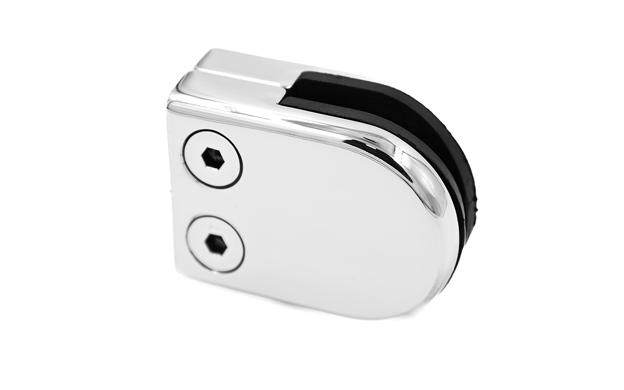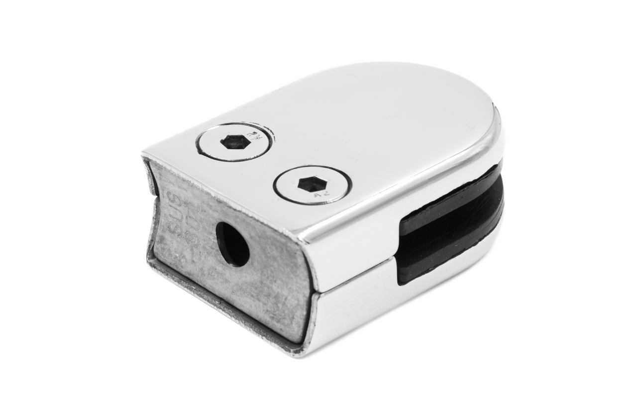 Стеклодержатель штампованный под стекло 8 мм (4+4 мм), под стойку Ø38.1 мм 40х24х55, полированный. Марка стали - AISI 304