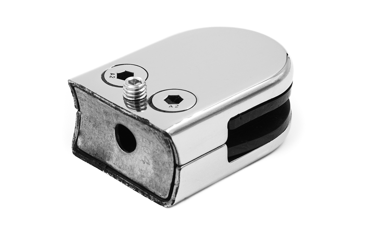 спроектирован и разработан для быстрого монтажа ограждений со стеклом толщиной 10 мм в расчете на сварку корпуса стеклодержателя со стойкой.