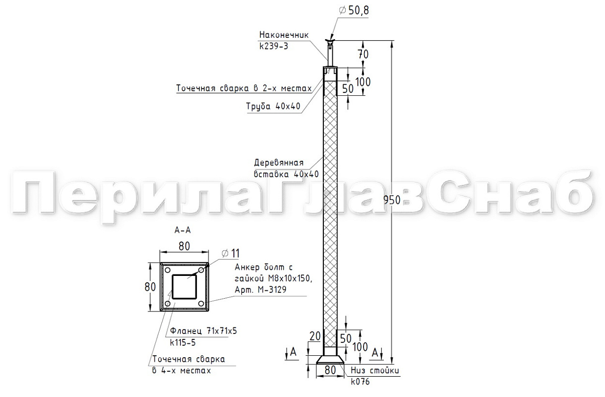 Готовая стойка 40х40х950 мм, деревянная, со вставками из нержавеющей стали 2х100 мм с 3 ригеледержателями k740-1-G купить в Казани