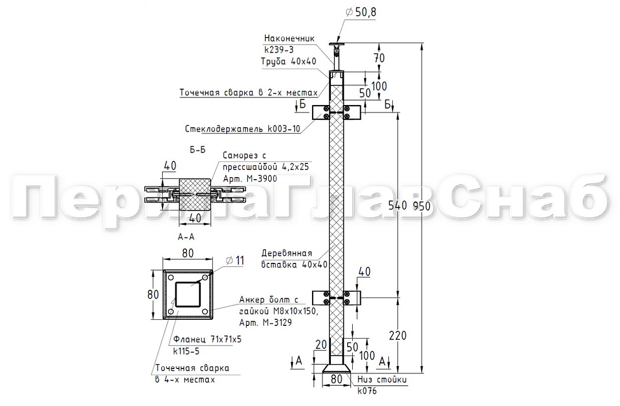 Стойка квадратная 40х40: 4 литых стеклодержателя, шлифованная, высота 950 мм AISI 304 k746-7 купить в Казани