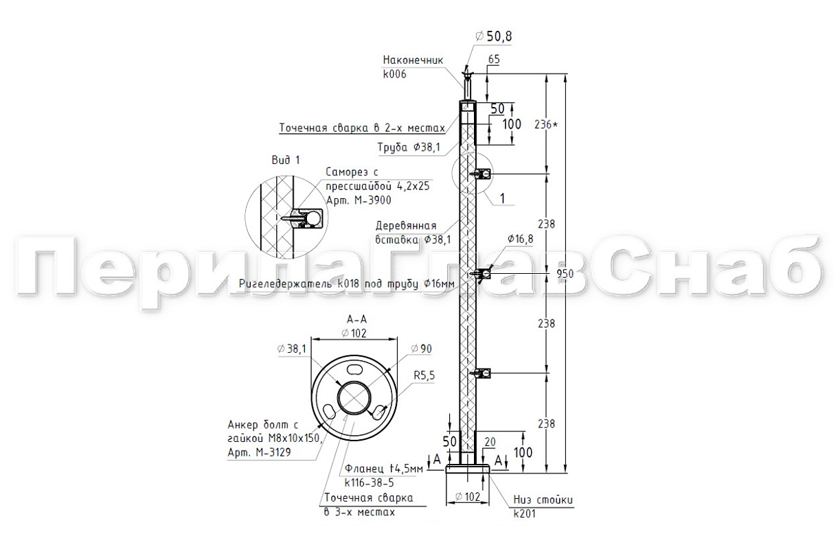 Готовая стойка Ø38,1 мм, с фланцем и наконечником, высота 950 мм, полированная (AISI 304) k702 купить в Казани