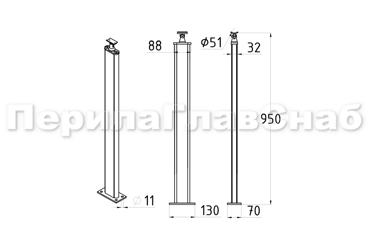 Стойка квадратная 40х40: 4 литых стеклодержателя, шлифованная, высота 950 мм AISI 304 k746-7 купить в Казани