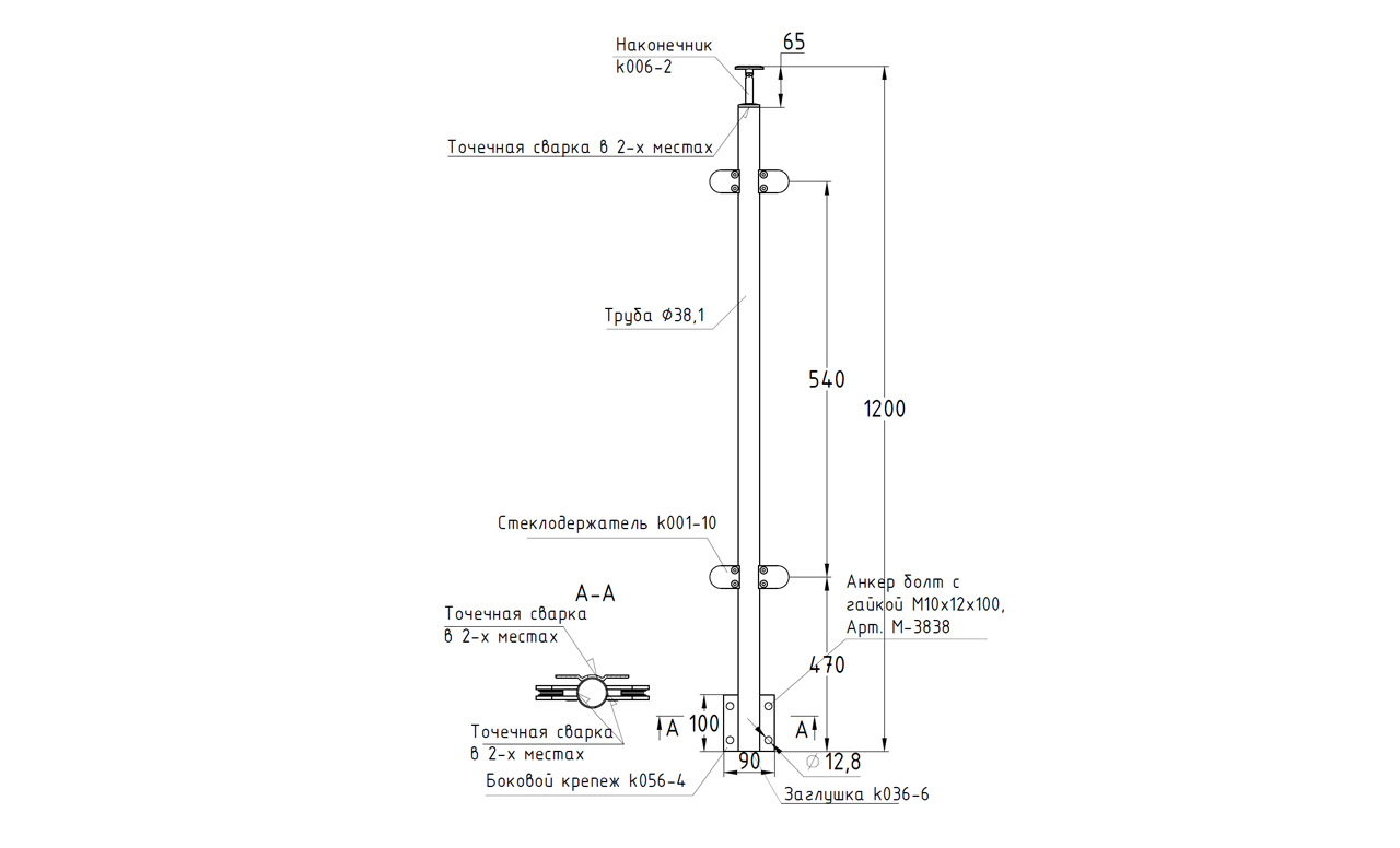 Стойка изготовлена на нашем производстве и готова к установке сразу после покупки. Используемая при изготовлении 304 марка стали позволяет применять данную стойку как внутри здания, так и на улице. Все элементы стойки приварены аргонной сваркой. Стеклодержатели под стекло 8мм ( С-8003, С-8023, С-8006, С-8047, С-8049). Наконечник под трубу ф38-50. Сварные швы на балясине убраны и идеально заполированы, а балясина ничем не уступает ограждениям сделанным профессиональными бригадами. Любой человек сможет сделать монтаж имея только отвертку, клей ( ф-1127, ф-1105), саморезы( М-3850, М-3847, М-3215), шестигранник ( k931, k932). Благодаря литым стеклодержателям стойка смотрится дорого и придает уверенности в надежности конструкции. Стойка используется как конечная правая. Для окончания ограждения используйте левую k756-R, а конечная стойка слева k756-L. Балясины со стеклом ставят в торговых и развлекательных центрах, в коттеджах, на балконах и верандах ресторанов. Удобство данной стойки, в том, что не нужно ловить отверстия в стекле, что бы закрепить стекло в стеклоджержателе. Вам достаточно замерить расстояние между стенками стеклодержателей и высоту стекла, что бы изготовить стекло и установить его на расстоянии друг от друга не больше 900 мм.