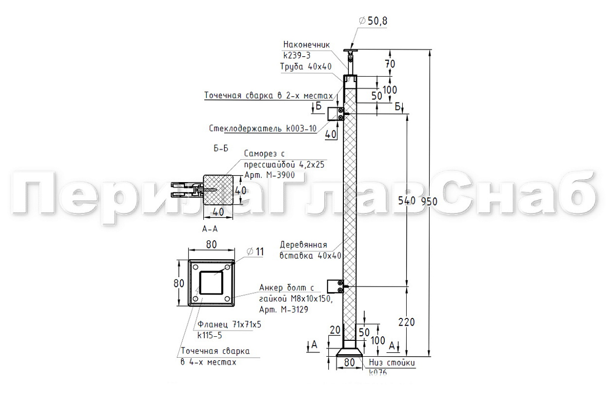 Готовая стойка 40х40х950 мм, деревянная, со вставками из нержавеющей стали 2х100 мм с 3 ригеледержателями k740-1-G купить в Казани
