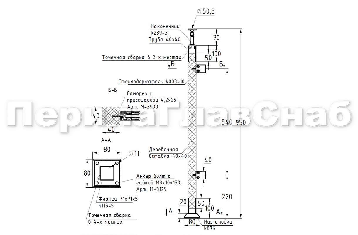 Готовая стойка 40х40х950 мм, деревянная, со вставками из нержавеющей стали 2х100 мм с 3 ригеледержателями k740-1-G купить в Казани