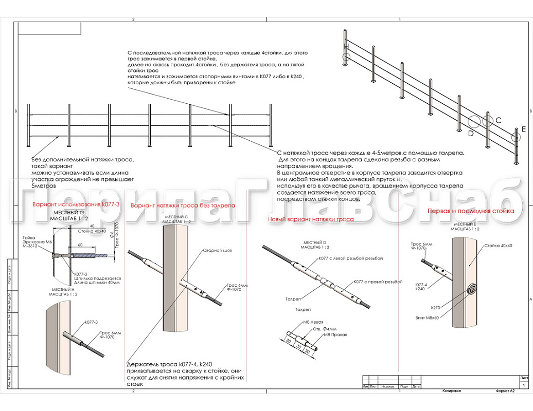 Таким образом, тросик фиксируется держателем на первой и последней стойке, дабы сохранить возможность регулировки силы натяжения.