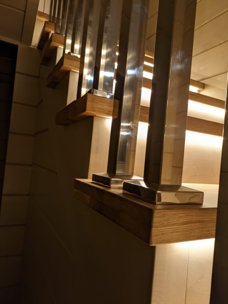 Одной из ключевых особенностей проекта является сочетание нержавеющей стали и дерева дуба.