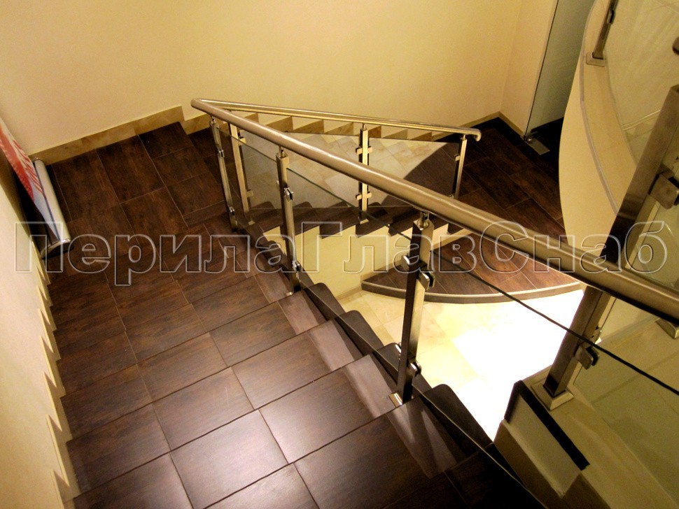 В числе наиболее сложных типов в галерее представлено ограждение с использованием моллированного или как его ещё часто называют «гнутого» стекла по радиусу поручня.