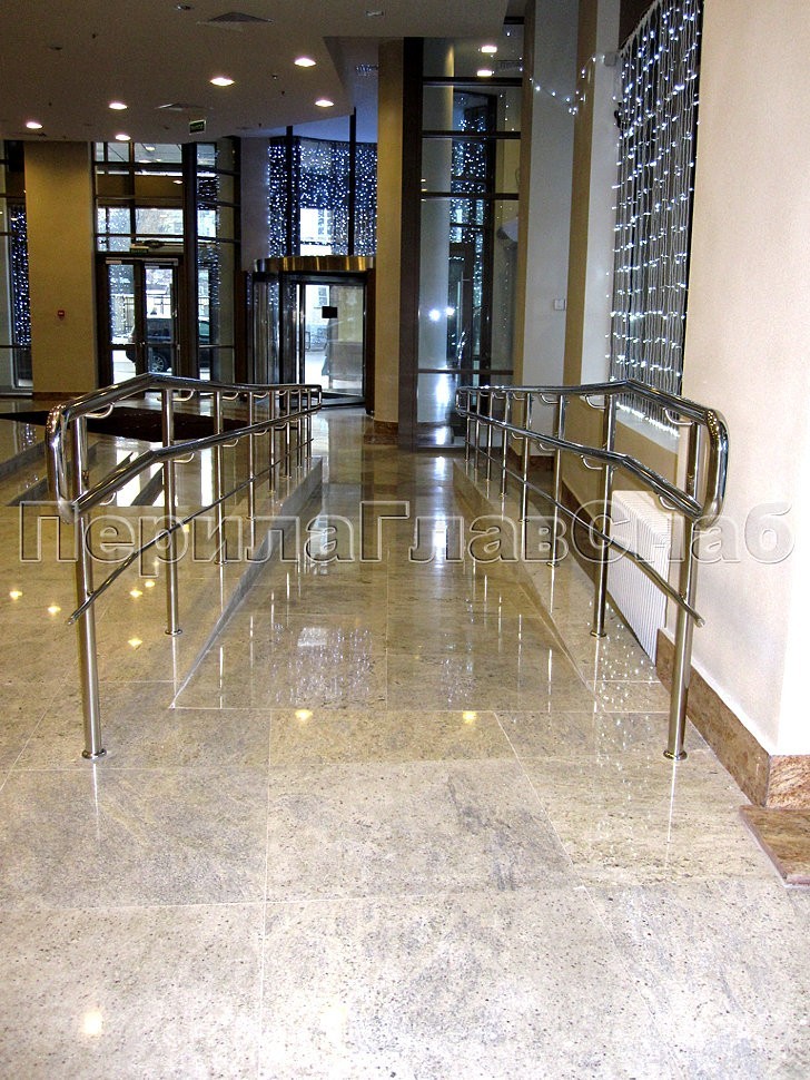 Характерной особенностью конструкций подобного рода является наличие нескольких поручней на разной высоте для облегчения хвата, как на уровне плеча человека, сидящего в инвалидной коляске, так и на уровне пояса ребенка среднего возраста и роста.
