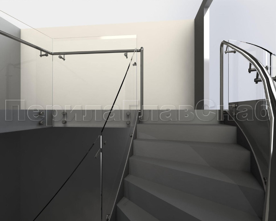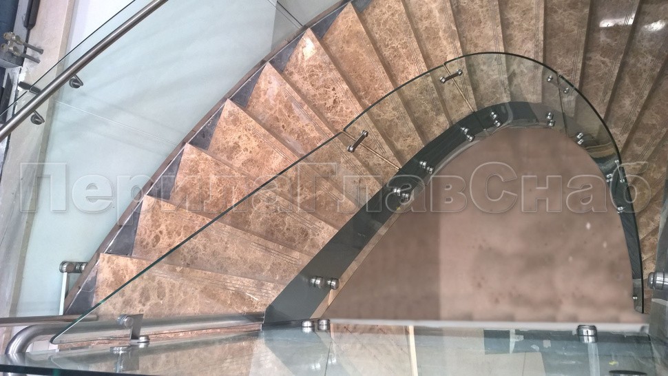 Стеклянные ограждения изготавливались из 12 мм прозрачного моллированного (гнутого) стекла. Замер и проектирования такого рода ограждений требуют высочайшей точности выполнения робот, а также высокого профессионализма сотрудником выполняющих работы.