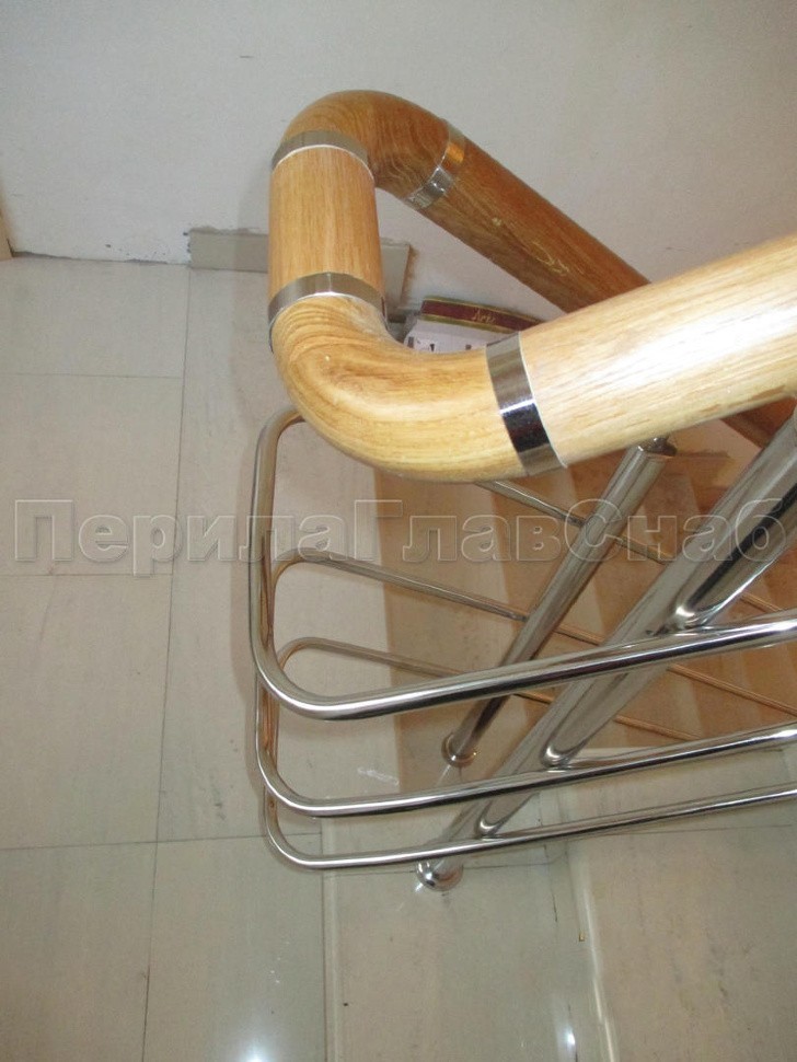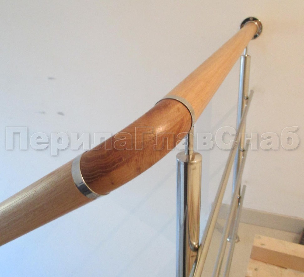 Было установлено нержавеющие ограждение маршевой лестницы с тремя ригелями. Поручень из белорусского дуба со специальной обработкой с сохранением текстуры. Поручень круглый (49 мм) с тремя поперечными склейками и продольными склейками. Такой поручень очень надежный и прослужит долгое время. Стойки устанавливались безударным бурением на химический анкер. Поручень и ригели для удобства, безопасности и жесткости конструкции завязаны на повороте.