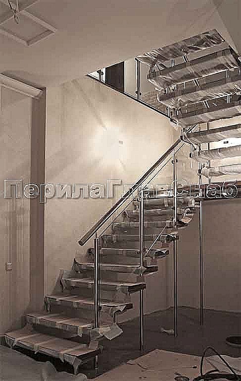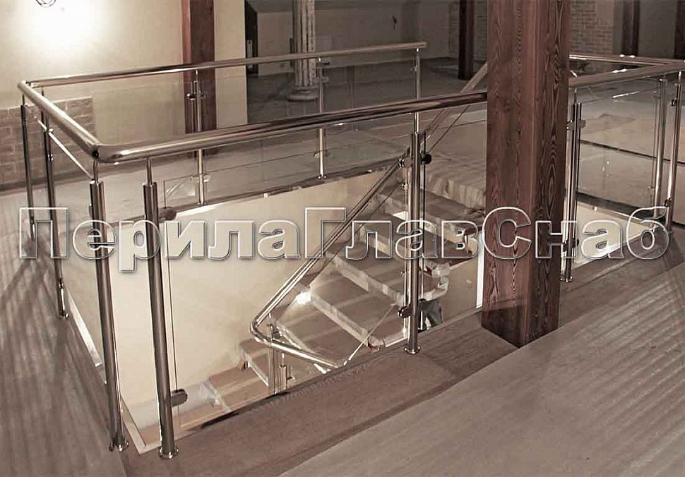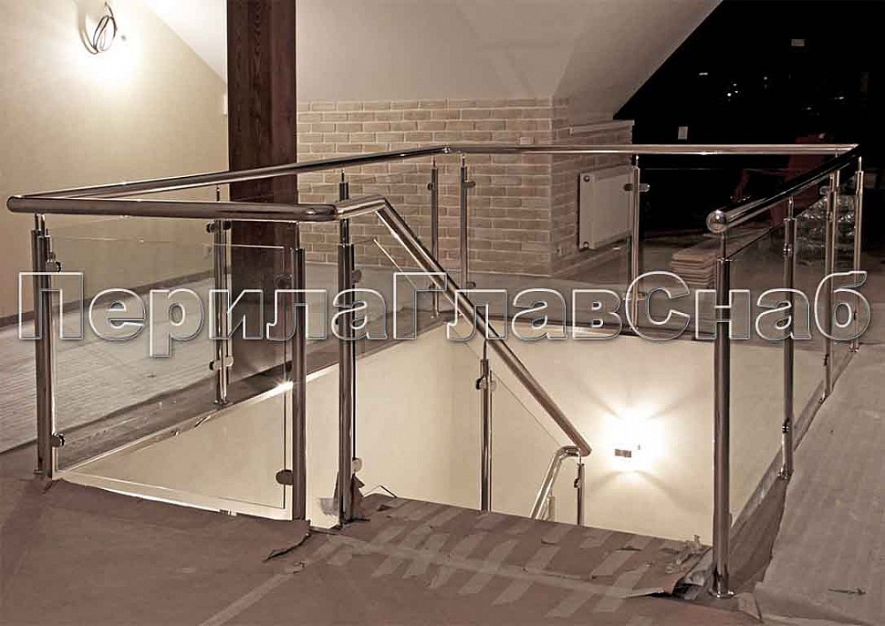 Стеклянные ограждения на круглых стойках с металлическим поручнем в частном доме.