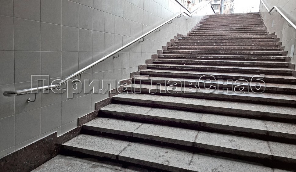 Пристенные поручни и сдвоенные пристенные поручни для детей и инвалидов в подземном переходе на шоссе Энтузиастов в Москве.