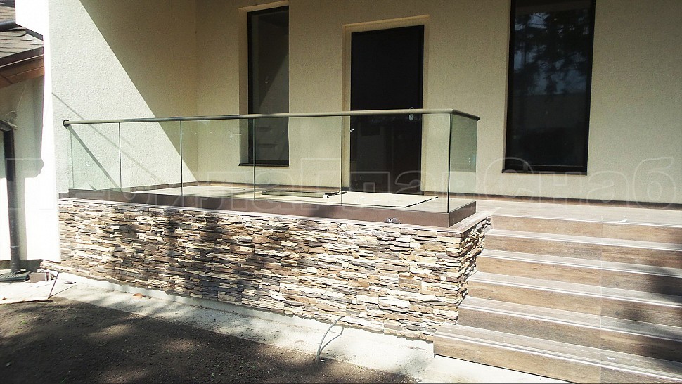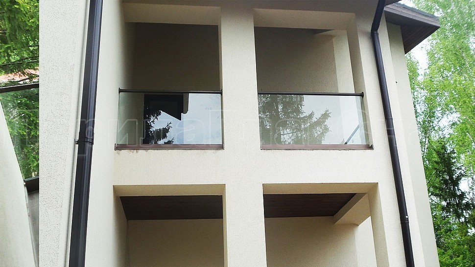 На данном объекте было установлено балконное ограждение высотой 950 мм с каленым прозрачным стеклом 10мм и с поручнем диаметром 50 мм из полированной нержавеющей стали AISI304, окрашенным по цвету анодировки профиля с креплением на стекло через паз. Стекло крепится на алюминиевый зажимной профиль, анодированный в цвет B32 Е6. Поручень завязан на поворотах, окончание фланец с креплением в стену. Крепление нержавеющих элементов ограждения между собой точечная аргонно-дуговая сварка, длина швов 2мм, с последующей зачисткой и полировкой, которые не имеют и намека на коррозию или прочие повреждения.