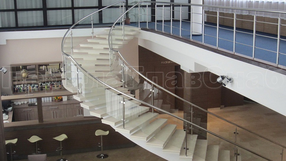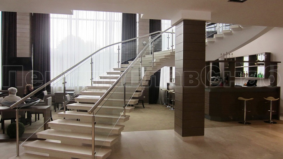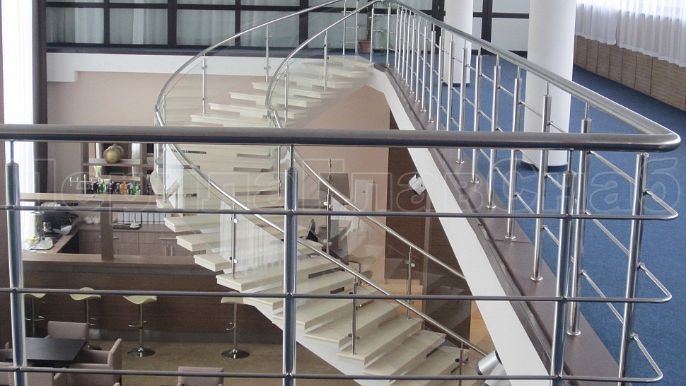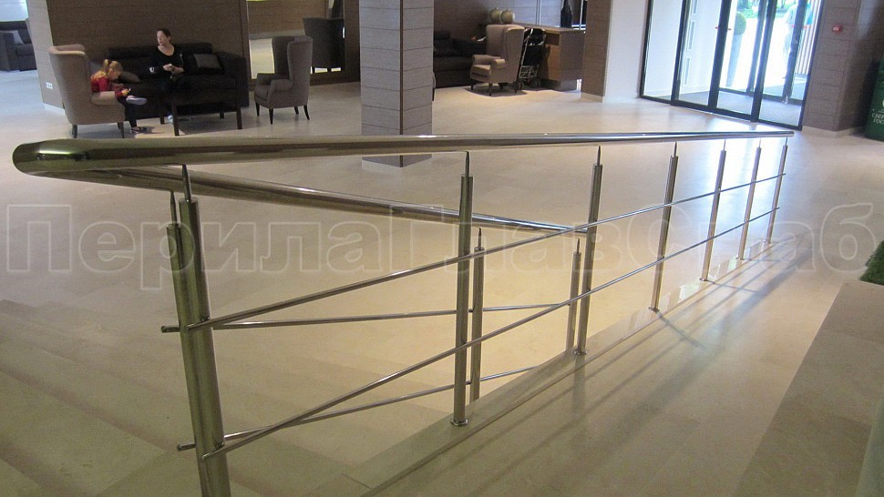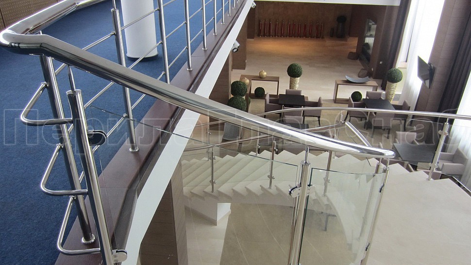 • Далее поручни цельностеклянных ограждений без разрыва переходят в ограждение из нержавеющей стали с тремя ригелями в атриуме.