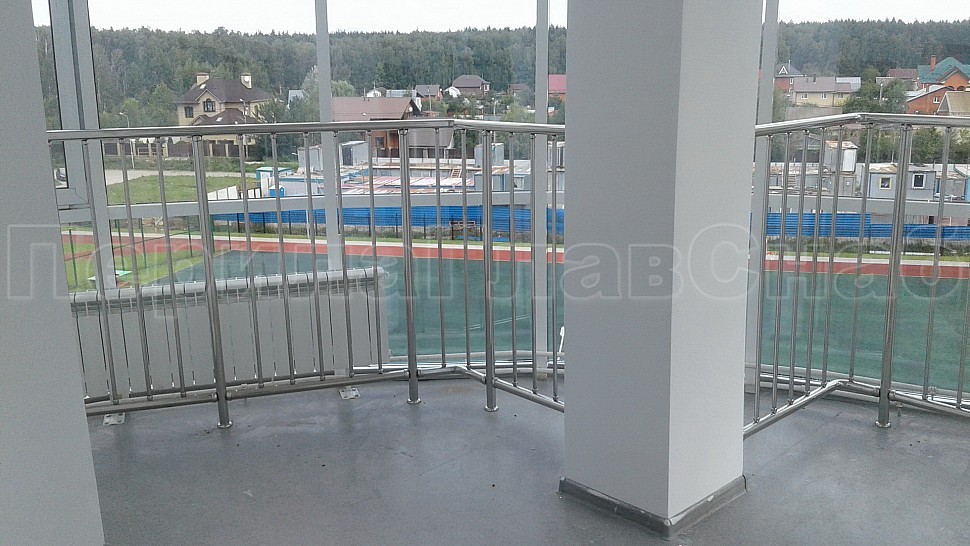 Снаружи здания были установлены ограждения на крыльце из полированной нержавеющей стали высотой 1200 мм. Труба стоек диаметром 38 мм крепится в бетонную поверхность методом алмазного бурения на глубину 70 мм, диаметр отверстия 42 мм. Установлены на расстоянии 300 мм друг от друга. Между стойками установлены пять ригелей горизонтальным заполнением, диаметр ригельной трубки 16мм, крепятся к стойкам при помощи сварки.