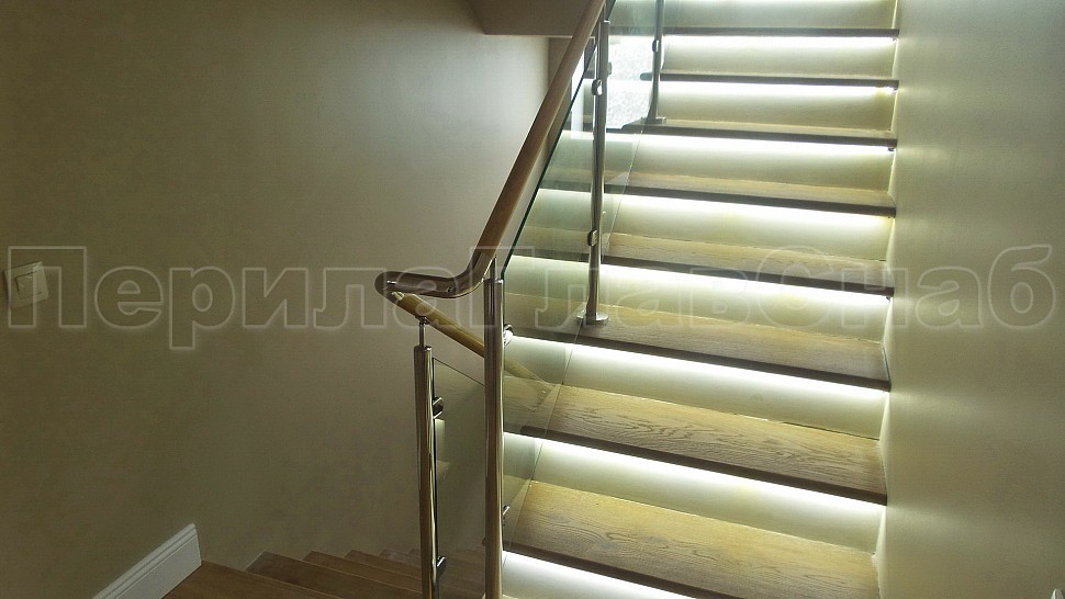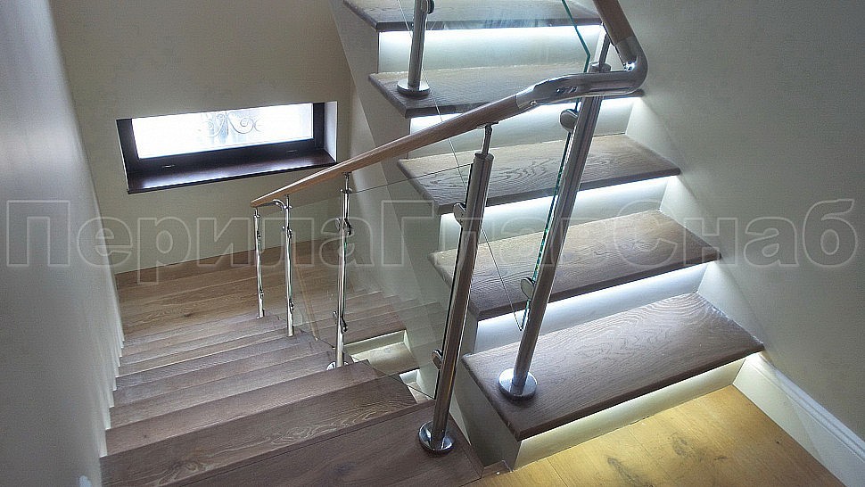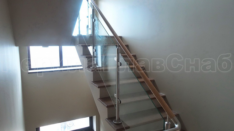 Стильное ограждение из нержавеющей стали с деревянным поручнем - оптимальное решение для частного дома. Деревянный поручень, в отличие от металлического, теплый на ощупь - за него удобно и приятно держаться. Сочетание натурального дерева и нержавеющей стали выглядит очень стильно и такое ограждение великолепно впишется в любой интерьер. В нашу компанию поступил такой заказ. Ограждения из полированной нержавеющей стали внутренние со стеклом высота 950 мм, стойки диаметром 38 мм, крепление сверху методом алмазного бурения диаметр 42 мм на глубину 70 мм, устанавливаются через две ступени в третью, на прямых участках не более 1000 мм друг от друга, наконечник стойки штырь; стекло закаленное прозрачное 8 мм, крепится на зажимные стеклодержатели; низ стойки декоративная крышка диаметр 56 мм, поручень деревянный диаметр 38 мм из дуба тонированный и лакированный, окончание поручня заглушка, уходов поручня в стену через фланец, поручень завязан нержавеющим отводом. Крепление нержавеющих элементов ограждения между собой точечная аргонно-дуговая сварка, с последующей зачисткой и полировкой.