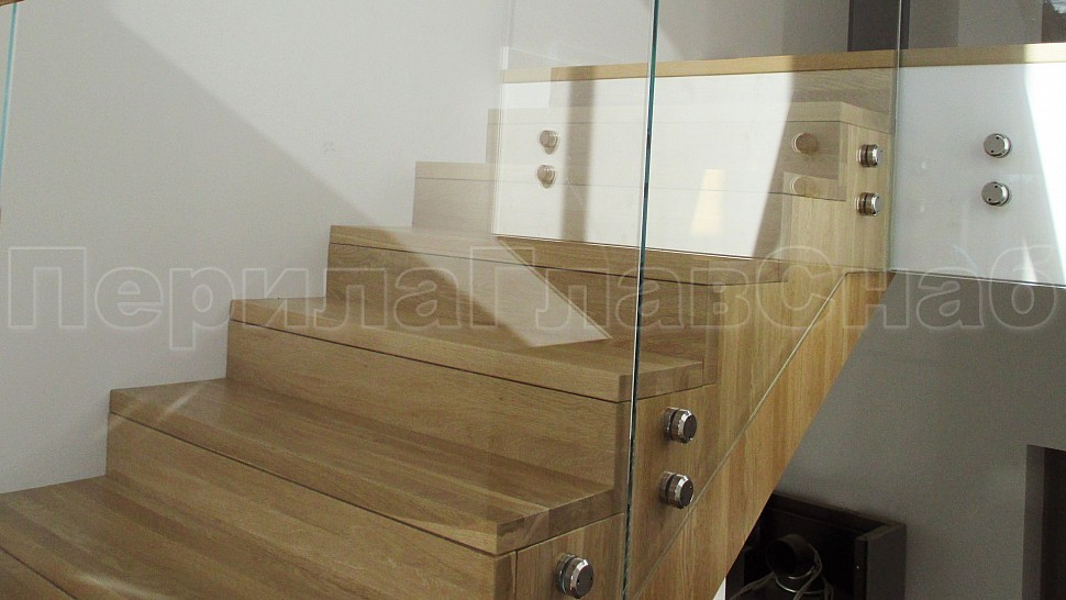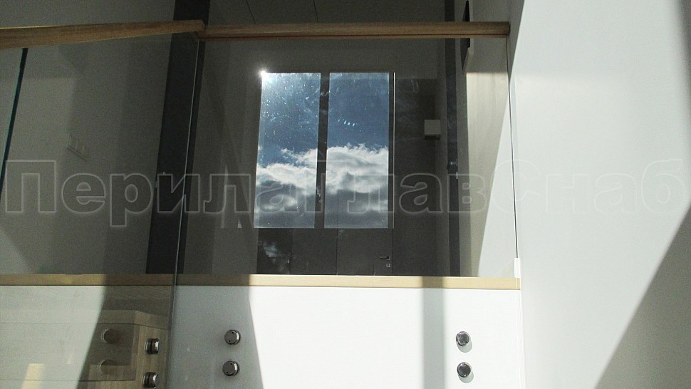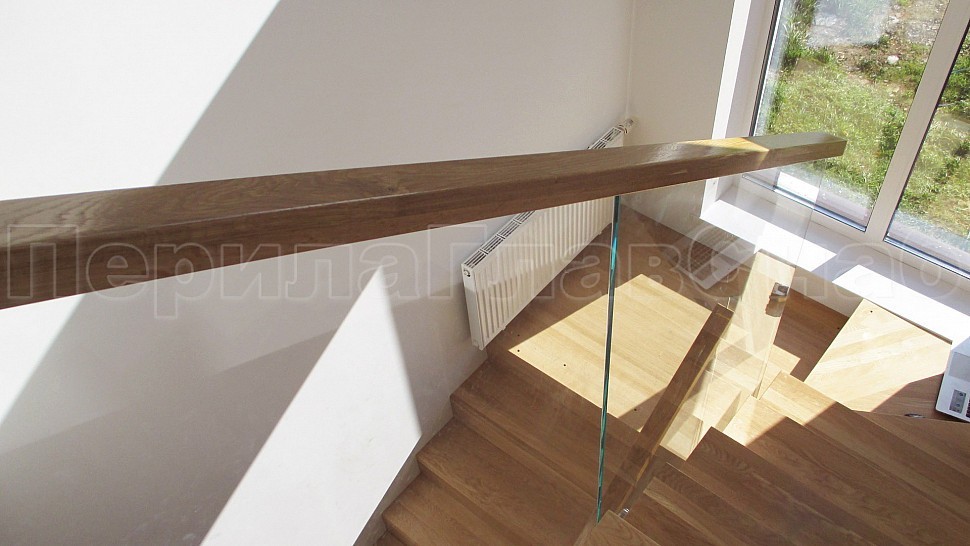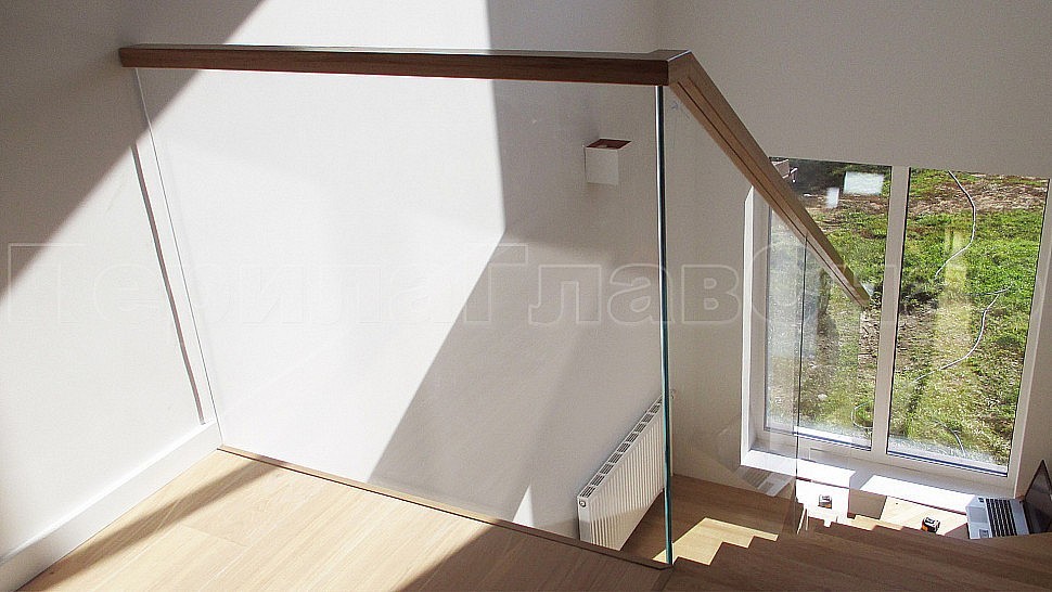 Заказ в частный дом на проектировку и установку цельностеклянных ограждений. Объект- двухмаршевая лестница и площадка. Всего было установлено 7 погонных метров ограждений. Каленое стекло оптивайт закреплено на боковых стеклодержателях к лестнице, толщина стекла- 10мм. Сверху на стекло установлен лакированный поручень из массива дуба. Между маршами также была установлена стеклянная перегородка, призванная обезопасить жильцов дома помладше. Поручень выполнен в тех же тонах, что и сама лестница, что придает общей конструкции гармоничный вид, а золотой цвет дуба создает визуальную легкость и отлично вписывается в светлый интерьер дома.