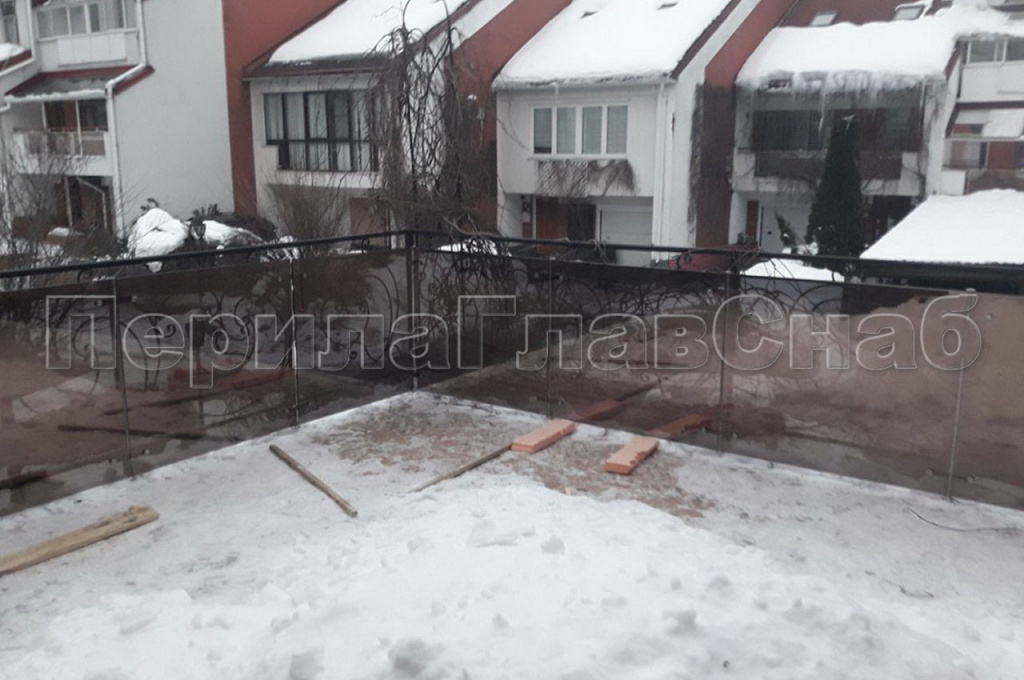 В ПерилаГлавСнаб поступил интересный запрос в зимний период времени. Необходимо было оградить от ветра и от лишних глаз летнюю террасу в Митинском районе города Москвы. Правильный подход «готовь сани с лета» позволит уже весной насладиться чаепитием и прочтением книги на открытом воздухе. У клиента уже стояло ограждение предусмотренное застройщиком, которое по нормам демонтировать строго запрещено. Нашими инженерами было предложено конструктивное решение в виде ограждения из закаленного стекла на стойках из нержавеющей стали AISI 304. Стекло держится на пластинчатых стекло держателях, технология которых позволяет намертво закрепить его. А это значит, что данный вид ограждения выдержит любую ветровую нагрузку. Стойки монтировали прямо в бетонное основание террасы на специальную зимнюю химию, что обеспечивало скорейшее застывание клеевого состава. Точная и выверенная работа инженера-конструктора позволила произвести безошибочный замер стекол на шестнадцати погонных метрах. Еще одной задачей проекта являлась непросматриваемость балкона. Была подобрана специальная двусторонняя защитная пленка, которую наносили на стекло в заводских условиях с гарантией. Со стороны улицы пленка дает эффект зеркала стеклу. Т.е. абсолютно не видно что происходит за ограждением. А со стороны террасы пленка имеет бронзовый оттенок, который перекликается с отделочными материалами стен и просматривается все, что происходит во дворе дома. Очень лаконичное и продуманное решение стоимостью всего 13 800 рублей за погонный метр.
