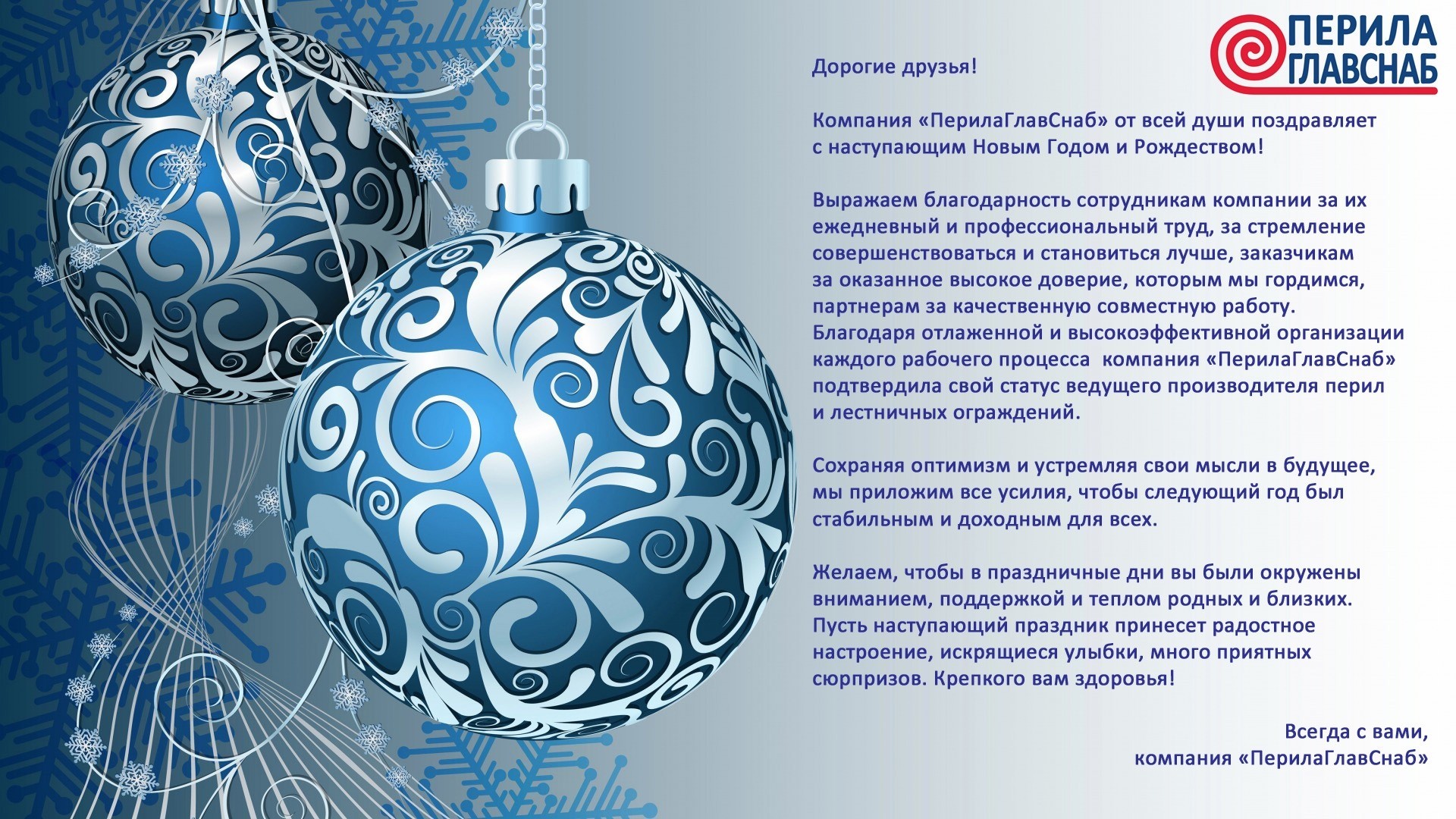 Компания «ПерилаГлавСнаб» от всей души поздравляет с наступающим Новым Годом и Рождеством!