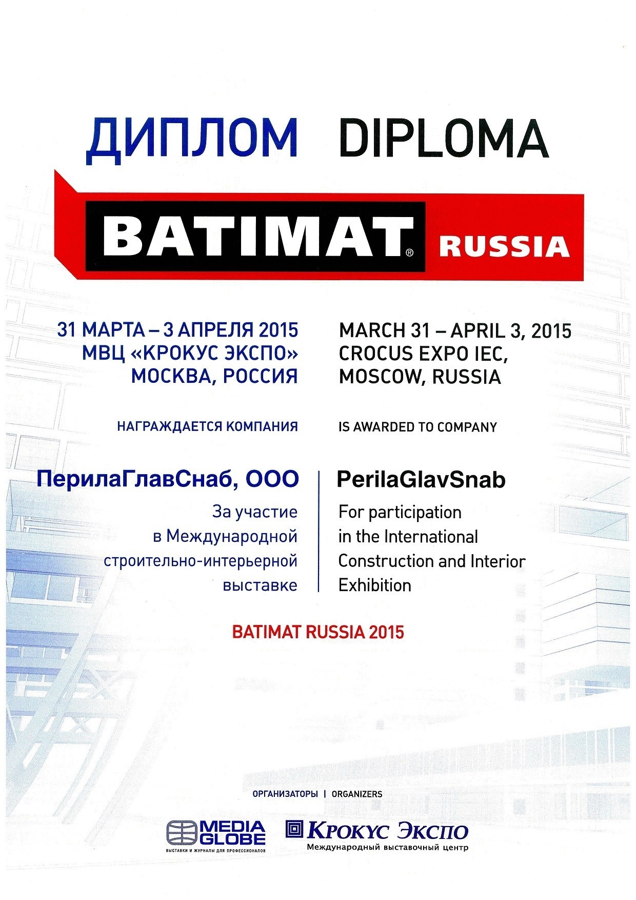Кроме этого, группа компаний "ПерилаГлавСнаб" стала участником Международной строительно-интерьерной выставки BUILDEX '2015.